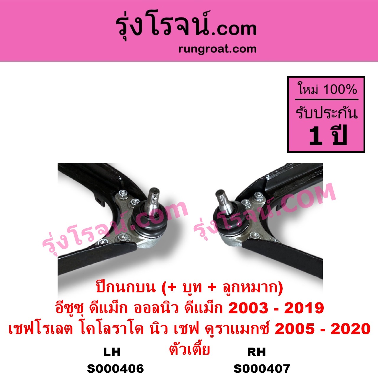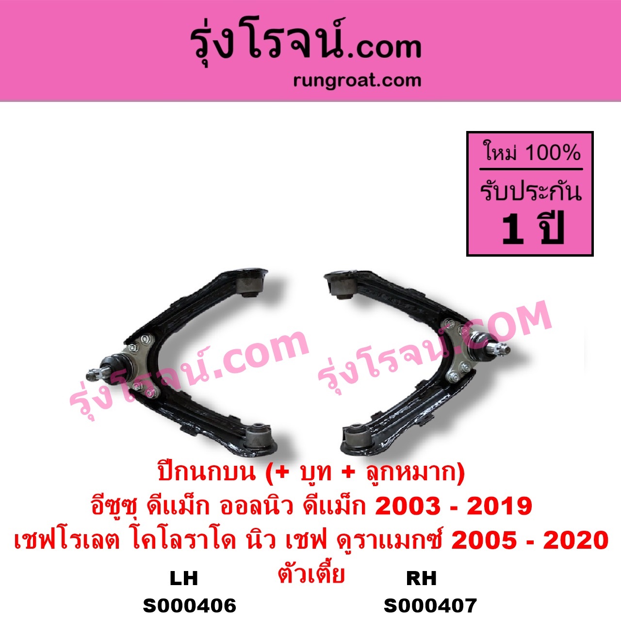 | S000406 | ปีกนกบน (+ บูท + ลูกหมาก) | CHEVROLET (เชฟโรเลต) / COLORADO (โคโลราโด 05/09) (ตา 2 ชั้น / ตาชั้นเดียว) , CHEVROLET (เชฟโรเลต) / COLORADO (โคโลราโด 12) (เชฟ ดูราแมกซ์, Z71) , ISUZU (อีซูซุ) / D-MAX (ดีแม็ก 03/05/07) (รุ่นแรก) , ISUZU (อีซูซุ) / D-MAX (ดีแม็ก 12/16) (V-CROSS / บลูเพาเวอร์) |