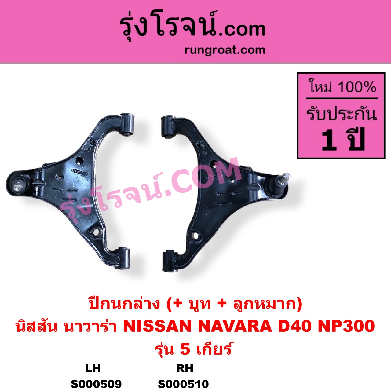 | S000510 | ปีกนกล่าง (+ บูท + ลูกหมาก) | NISSAN (นิสสัน) / NAVARA (นาวาร่า D40 2007 – 2013) (รุ่นแรก D40) , NISSAN (นิสสัน) / NAVARA (นาวาร่า NP300 D23 2014 – 2023) (รุ่น 2 D23) |