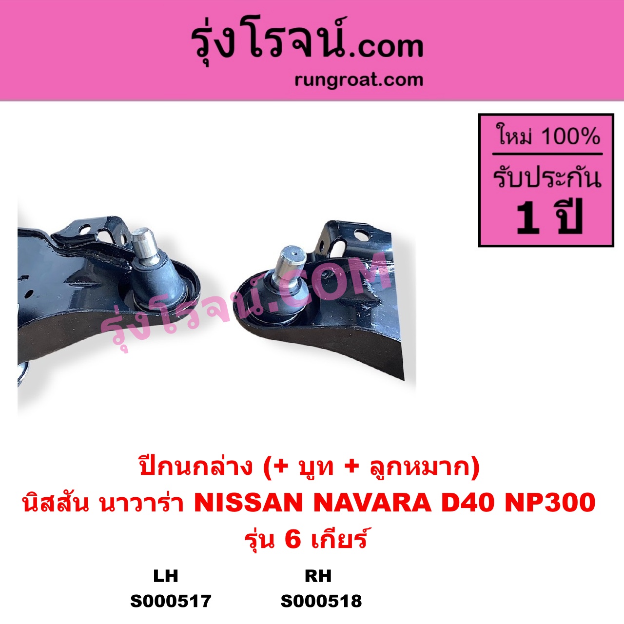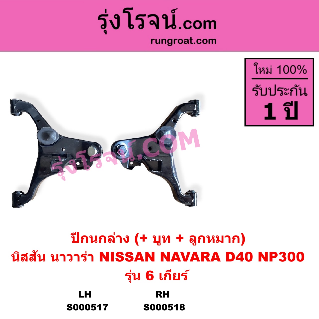 S000518 ปีกนกล่าง + บูท + ลูกหมาก NISSAN นิสสัน NAVARA นาวาร่า D40 2007 – 2013 รุ่นแรก D40 NAVARA นาวาร่า NP300 D23 2014 – 2023 รุ่น 2 D23 6 เกียร์ RH