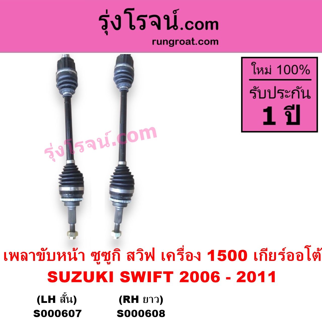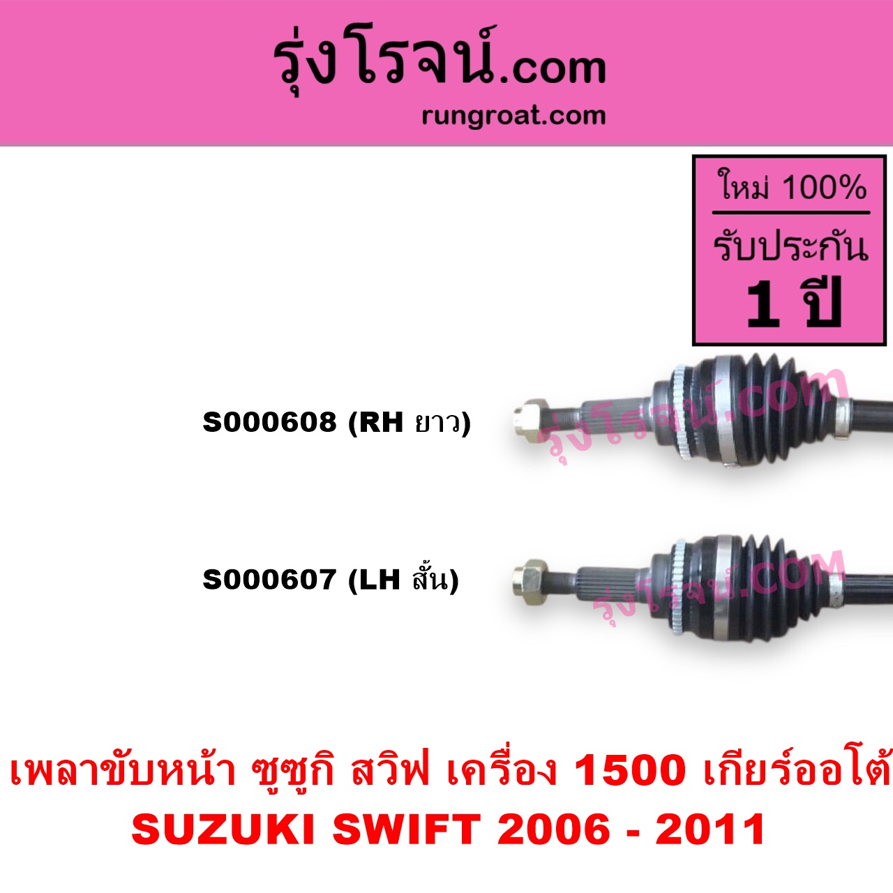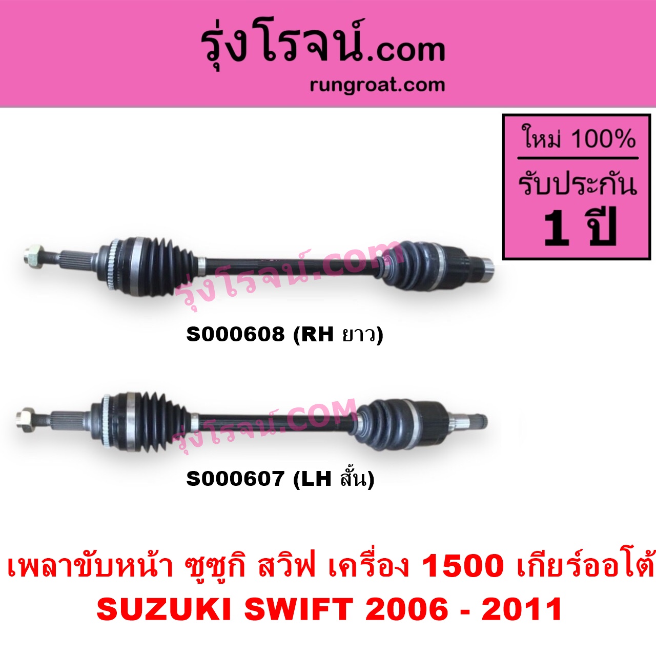 | S000608 | เพลาขับหน้า | SUZUKI (ซูซูกิ) / SWIFT (สวิฟ 2006 – 2011) (รุ่นแรก เครื่อง 1.5) | เครื่อง 1500 (เกียร์ออโต้) (RH ยาว) | ไต้หวัน (ใหม่) |