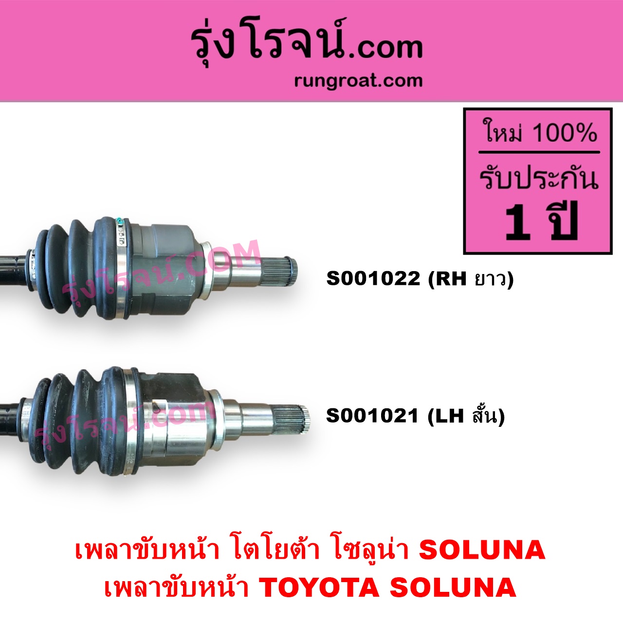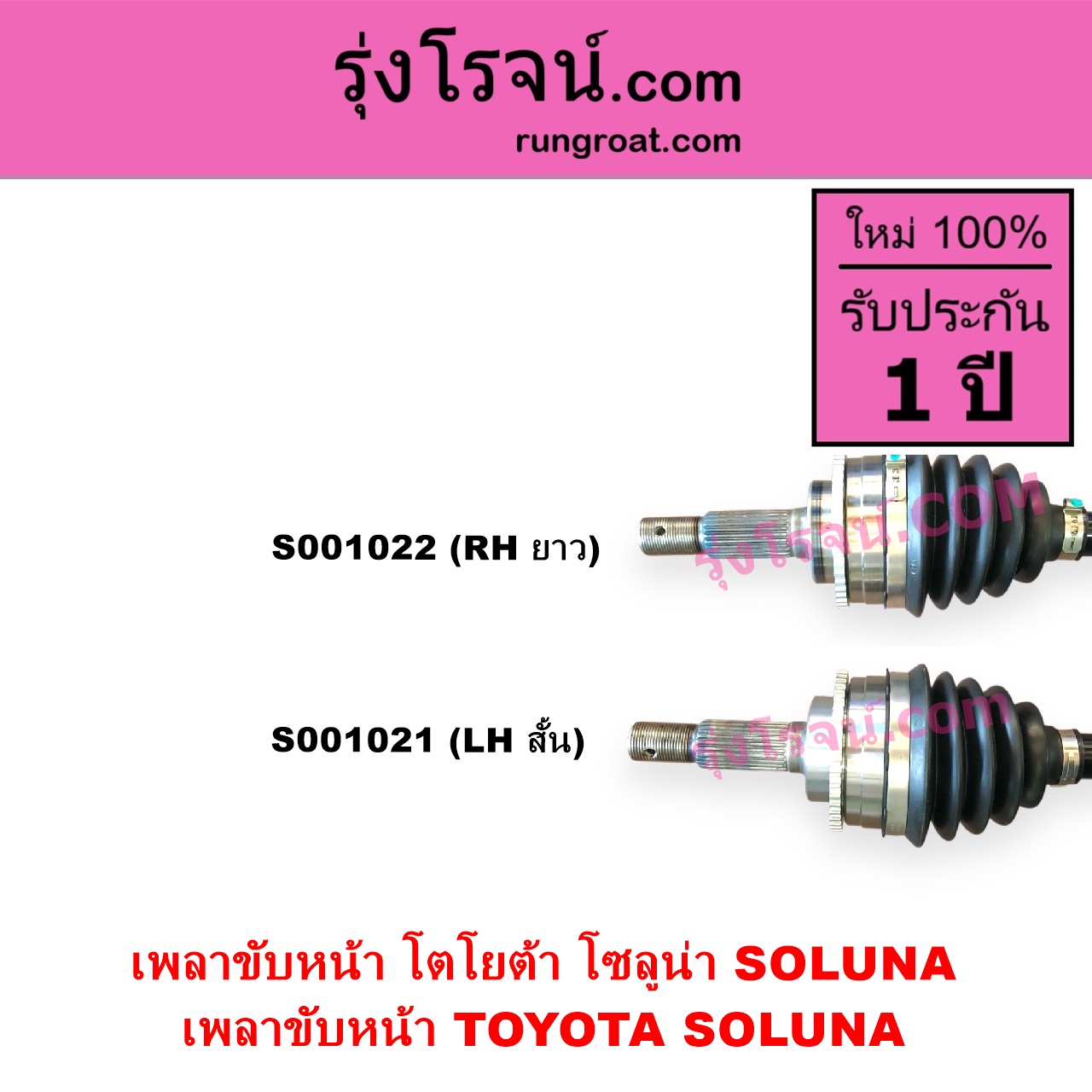 | S001022 | เพลาขับหน้า | TOYOTA (โตโยต้า) / SOLUNA (โซลูน่า 1997 – 2002) | (ABS) (เกียร์ออโต้-กระปุก เหมือนกัน) (RH ยาว) | ไต้หวัน (ใหม่) |