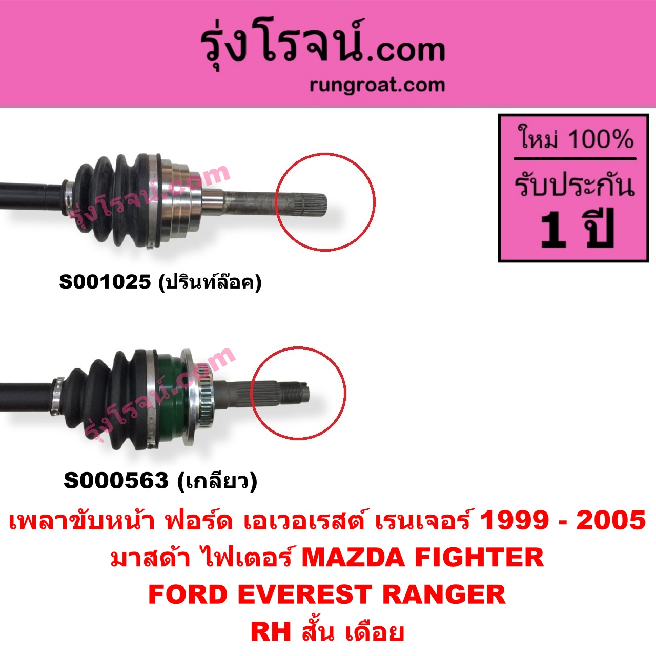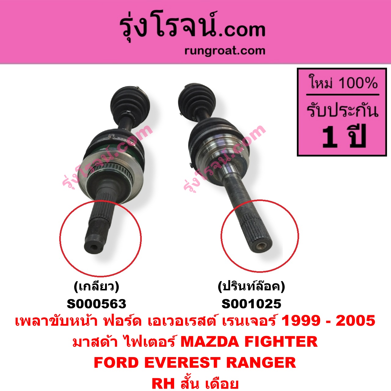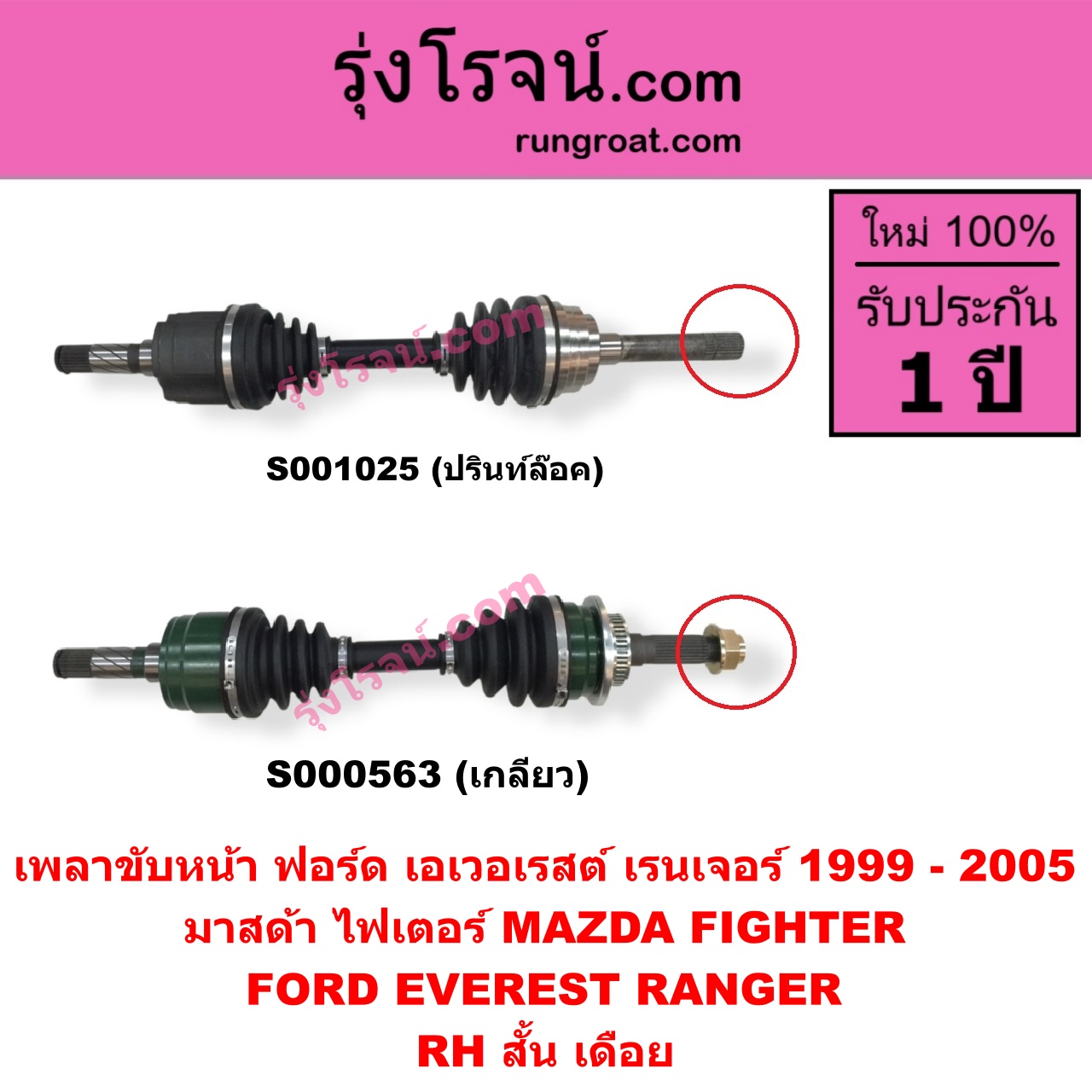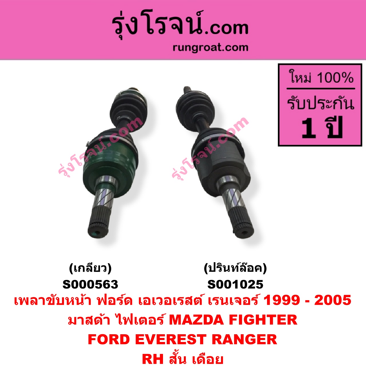| S001025 | เพลาขับหน้า | FORD (ฟอร์ด) / EVEREST (เอเวอเรสต์ 2003 – 2005) (รุ่นแรก) , FORD (ฟอร์ด) / RANGER (เรนเจอร์ 1999 – 2005) (รุ่นแรก WL 12 วาล์ว) , MAZDA (มาสด้า) / FIGHTER (ไฟเตอร์ 1997 – 2005) |