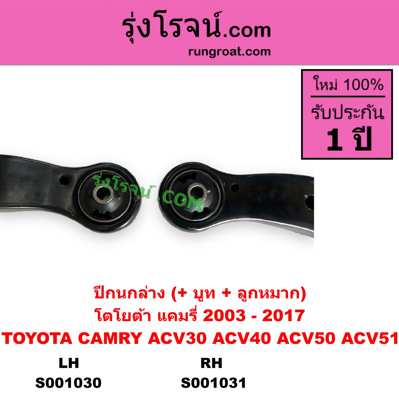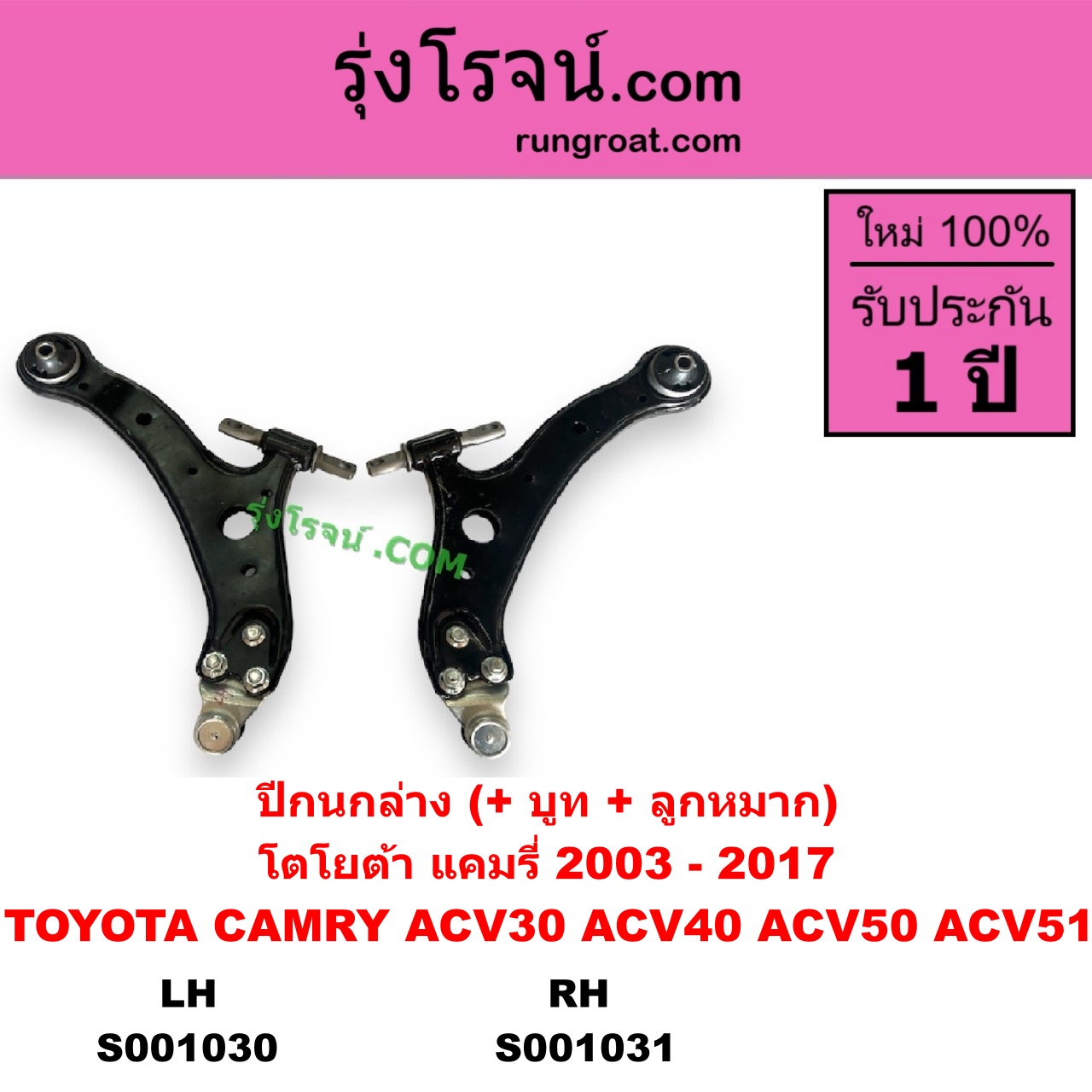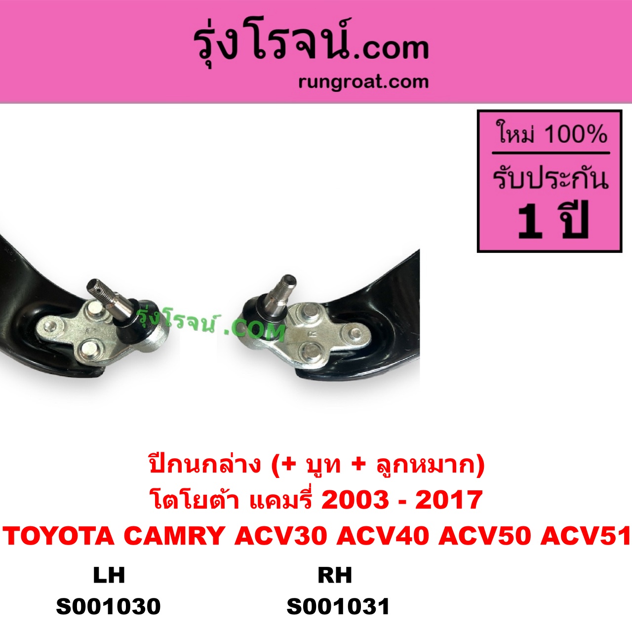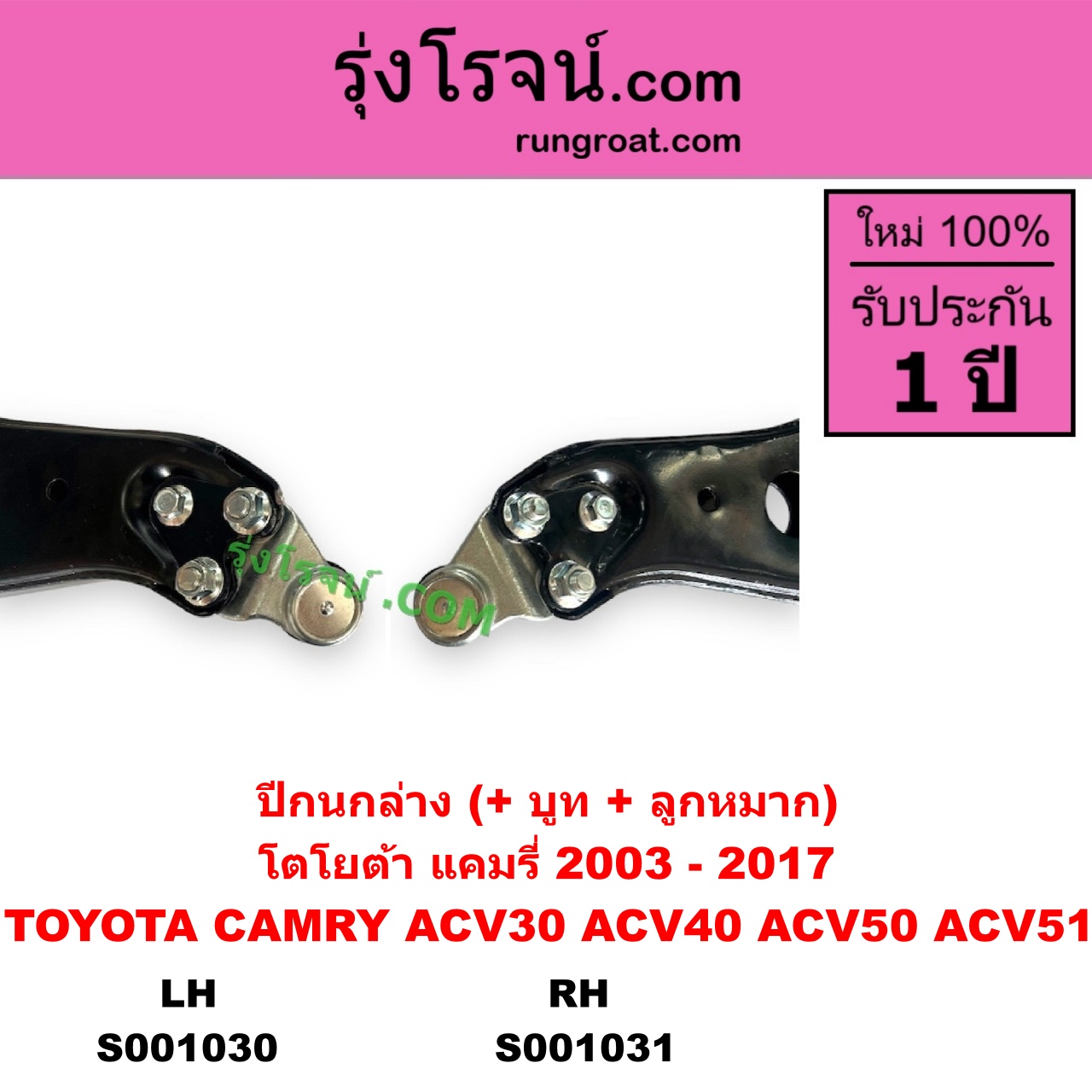 | S001031 | ปีกนกล่าง (+ บูท + ลูกหมาก) | TOYOTA (โตโยต้า) / CAMRY (คัมรี่ แคมรี่ 2003 – 2006) (ผู้นำ, ท้ายหงส์, ACV30) , TOYOTA (โตโยต้า) / CAMRY (คัมรี่ แคมรี่ 2007 – 2011 ไฮบริด) (ACV40) , TOYOTA (โตโยต้า) / CAMRY (คัมรี่ แคมรี่ 2012 – 2017) (ACV50, ACV51) |