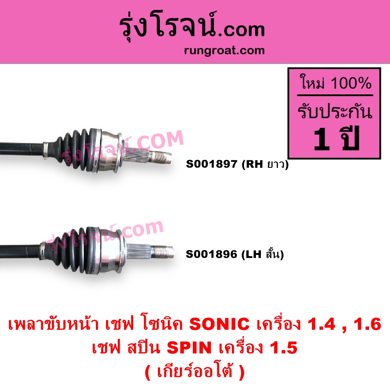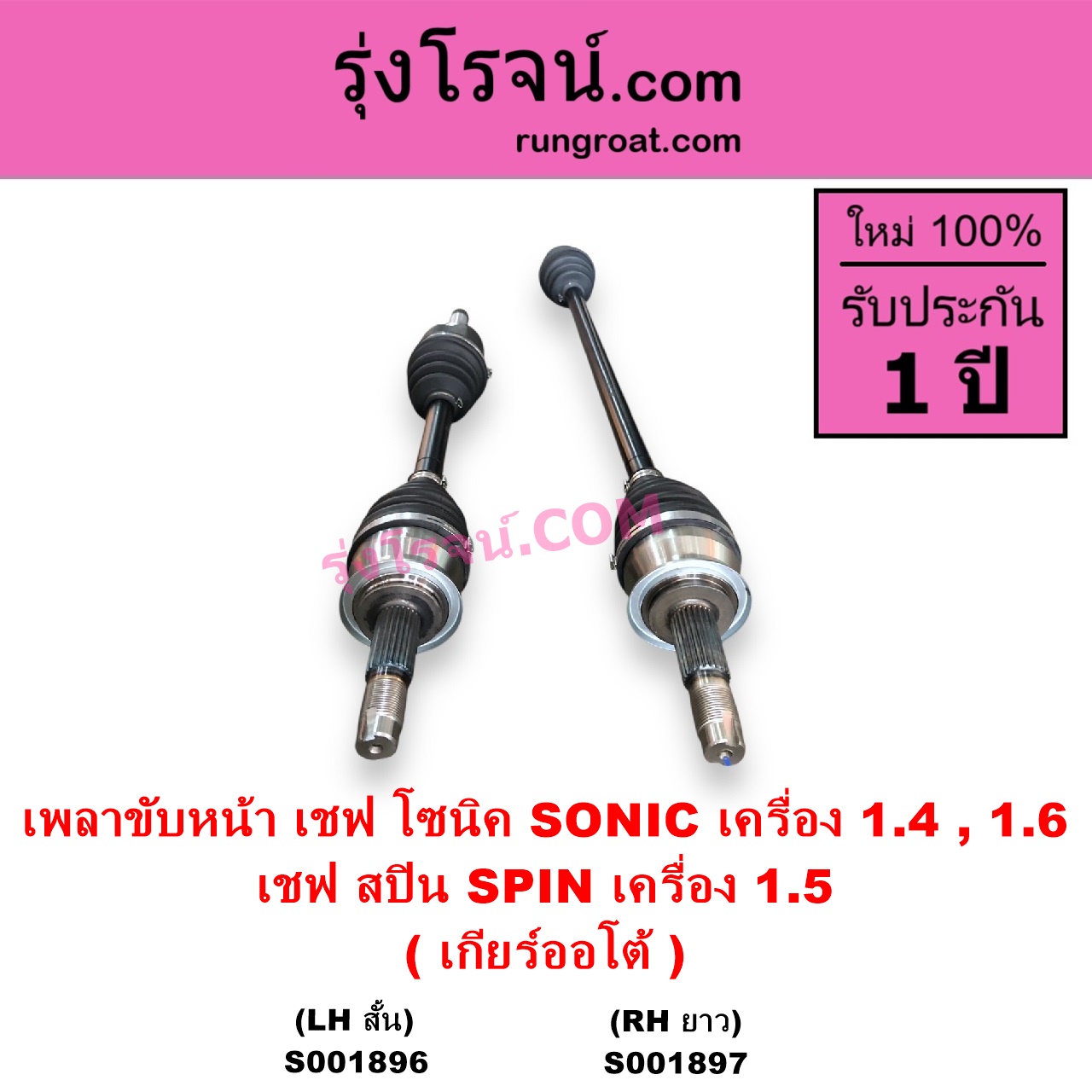 | S001896 | เพลาขับหน้า | CHEVROLET (เชฟโรเลต) / SONIC (โซนิค 1.4 1.6) , CHEVROLET (เชฟโรเลต) / SPIN (สปิน 1.5) |