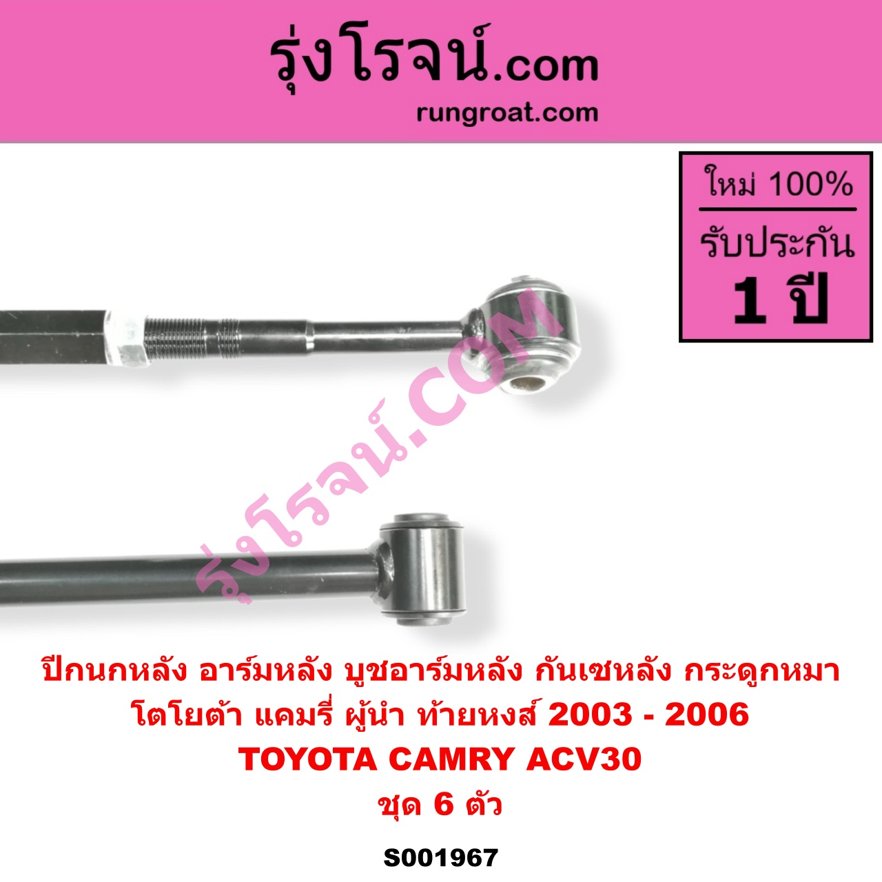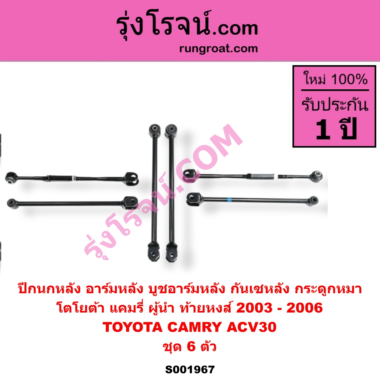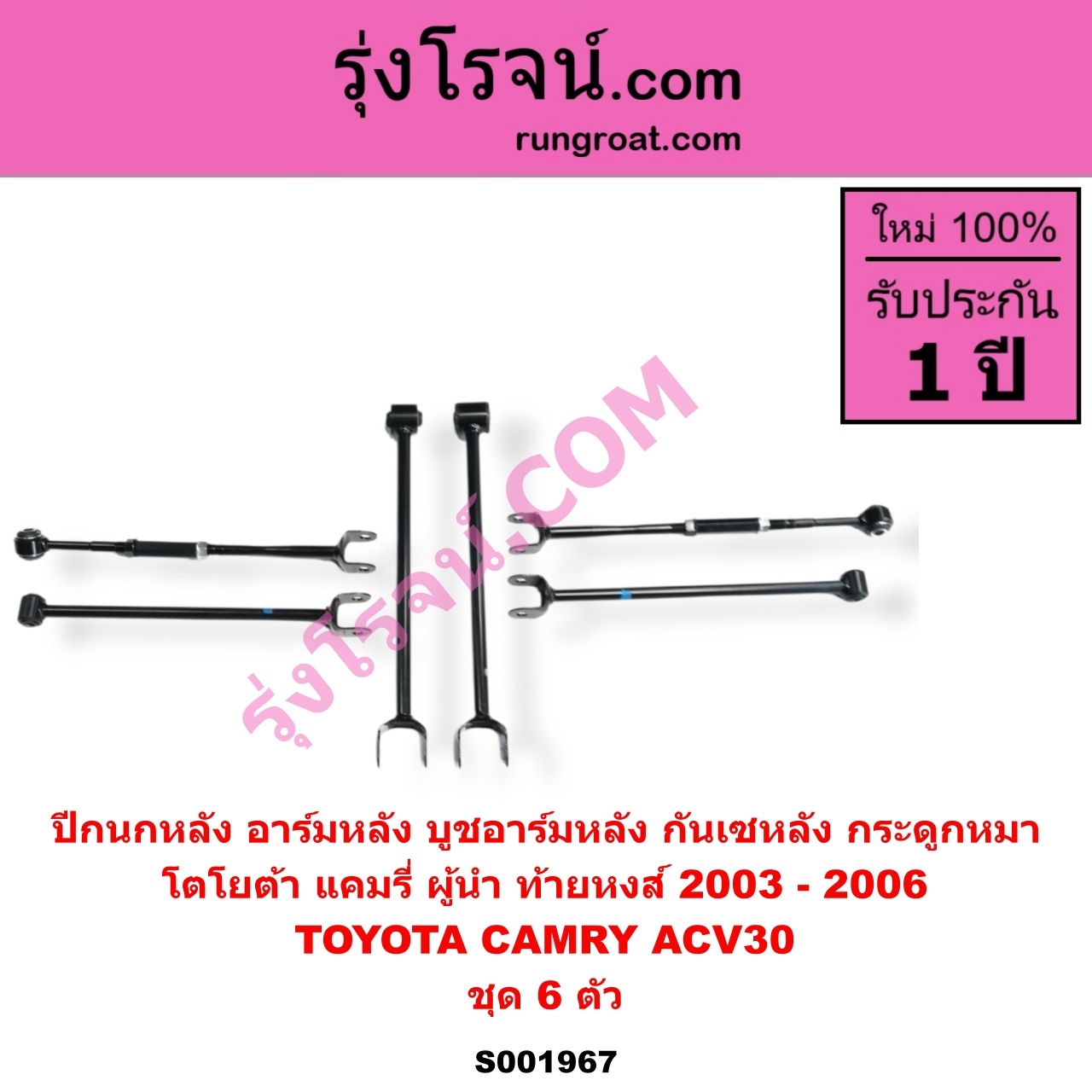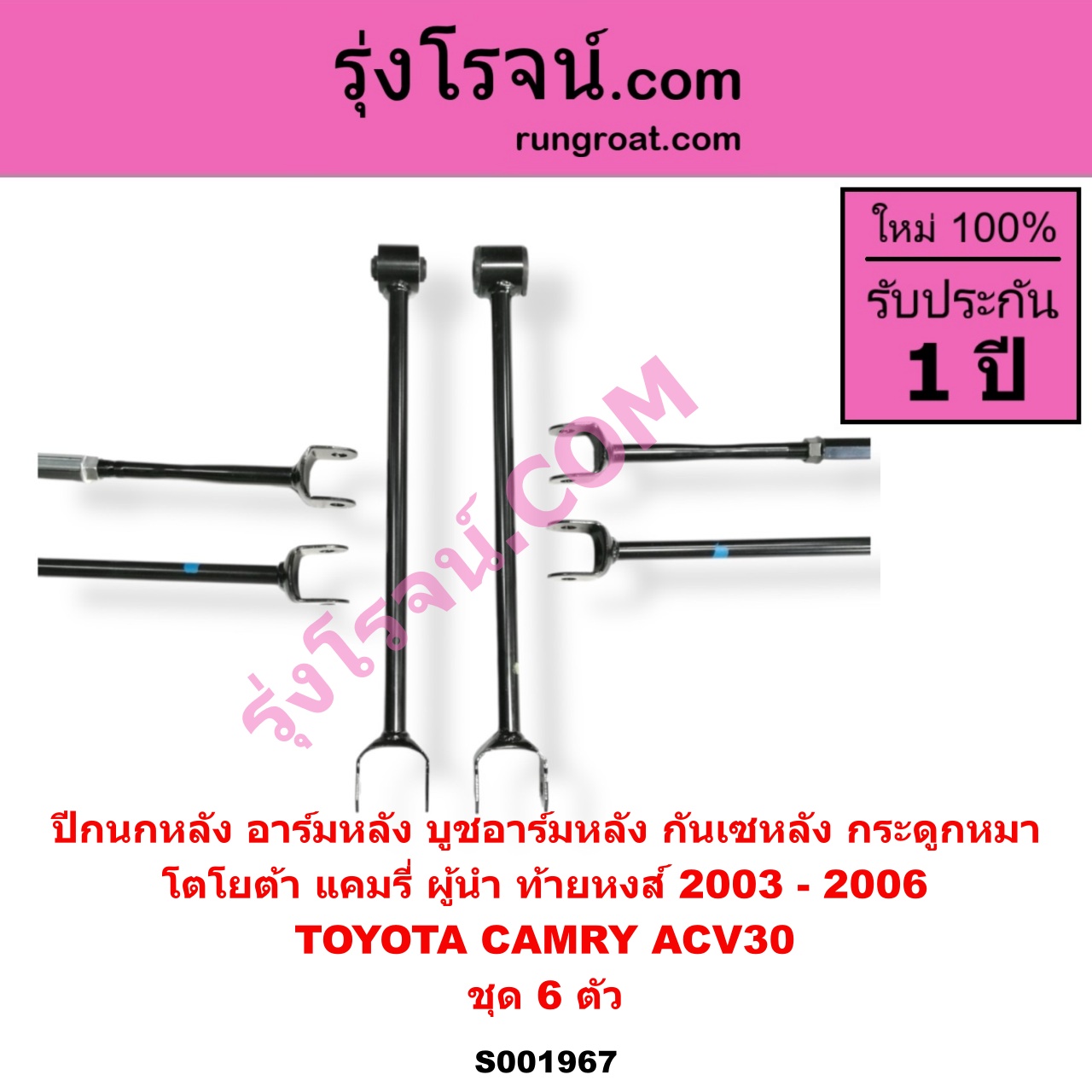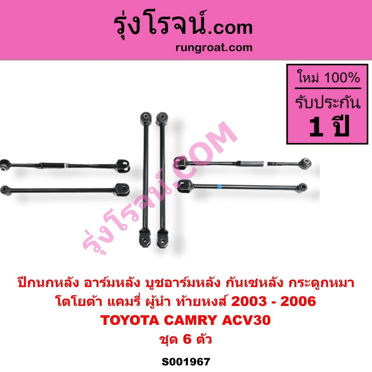 | S001967 | ปีกนกหลัง, อาร์มหลัง, บูชอาร์มหลัง, กันเซหลัง, กระดูกหมา | TOYOTA (โตโยต้า) / CAMRY (คัมรี่ แคมรี่ 2003 – 2006) (ผู้นำ, ท้ายหงส์, ACV30) | ชุด 6 ตัว | ไต้หวัน (ใหม่) |
