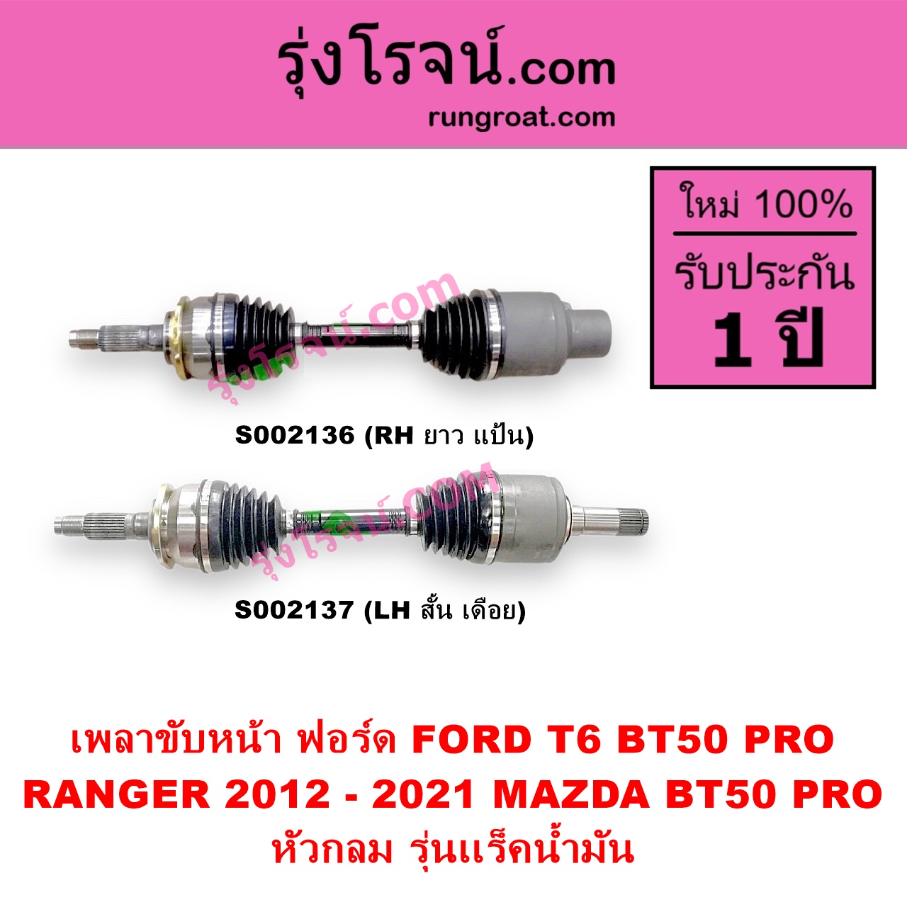 | S002137 | เพลาขับหน้า | FORD (ฟอร์ด) / RANGER (เรนเจอร์ T6 T7 2012 – 2021) (ไวล์ดแทรค แร็ปเตอร์ WILD TRAK RAPTOR) , MAZDA (มาสด้า) / BT-50 PRO (บีที 50 โปร 2012 – 2020) |
