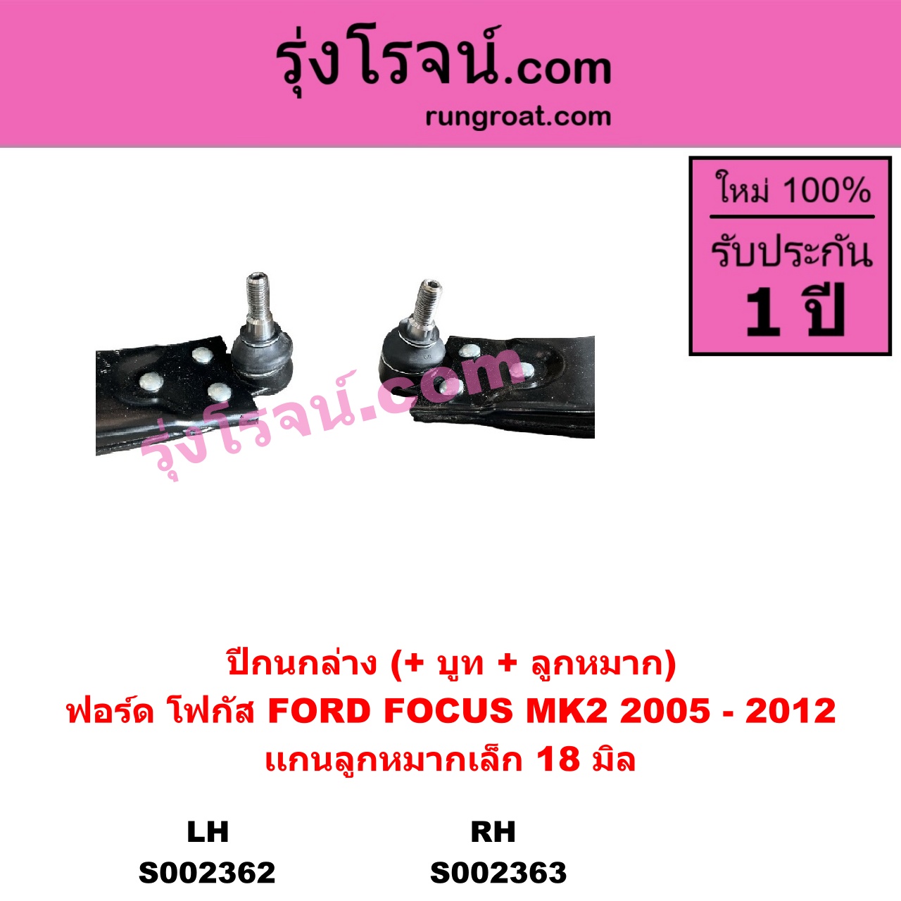 | S002363 | ปีกนกล่าง (+ บูท + ลูกหมาก) | FORD (ฟอร์ด) / FOCUS (โฟกัส 05/09) (รุ่นแรก) (MK2) | RH (เเกนลูกหมากเล็ก 18 มิล) | ไต้หวัน (ใหม่) |
