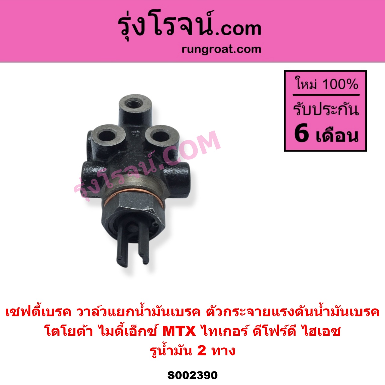 | S002390 | เซฟตี้เบรค (วาล์วแยกน้ำมันเบรค, ตัวกระจายแรงดันน้ำมันเบรค) | TOYOTA (โตโยต้า) / HERO (ฮีโร่ 1886 / 1888) (LN50, LN56) , TOYOTA (โตโยต้า) / HIACE (ไฮเอซ LH112 LH125 LH130 YH184) (รถตู้หัวจรวด 3L 5L) , TOYOTA (โตโยต้า) / LN106 (ไมตี้ X 4WD) , TOYOTA (โตโยต้า) / LN130 (SURF, เซิฟ) , TOYOTA (โตโยต้า) / LN180/185 (NEW SURF, นิว เซิฟ) , TOYOTA (โตโยต้า) / LN65 (ฮีโร่ 4X4) , TOYOTA (โตโยต้า) / MTX (ไมตี้เอ็กซ์ 1988 – 1996) , TOYOTA (โตโยต้า) / SPORTRIDER (สปอร์ตไรเดอร์) , TOYOTA (โตโยต้า) / TIGER/TIGER D4D (ไทเกอร์ / ไทเกอร์ ดีโฟร์ดี) |