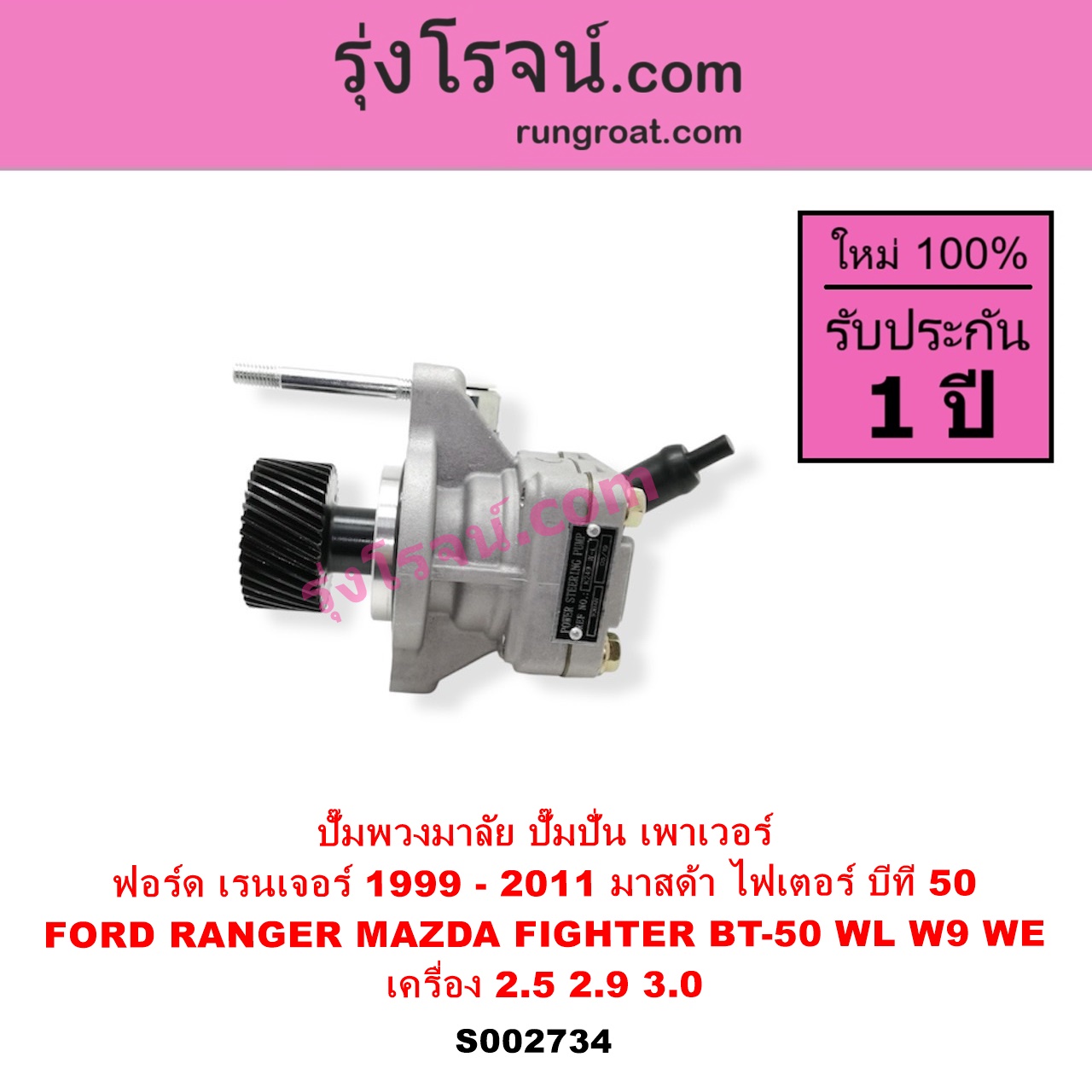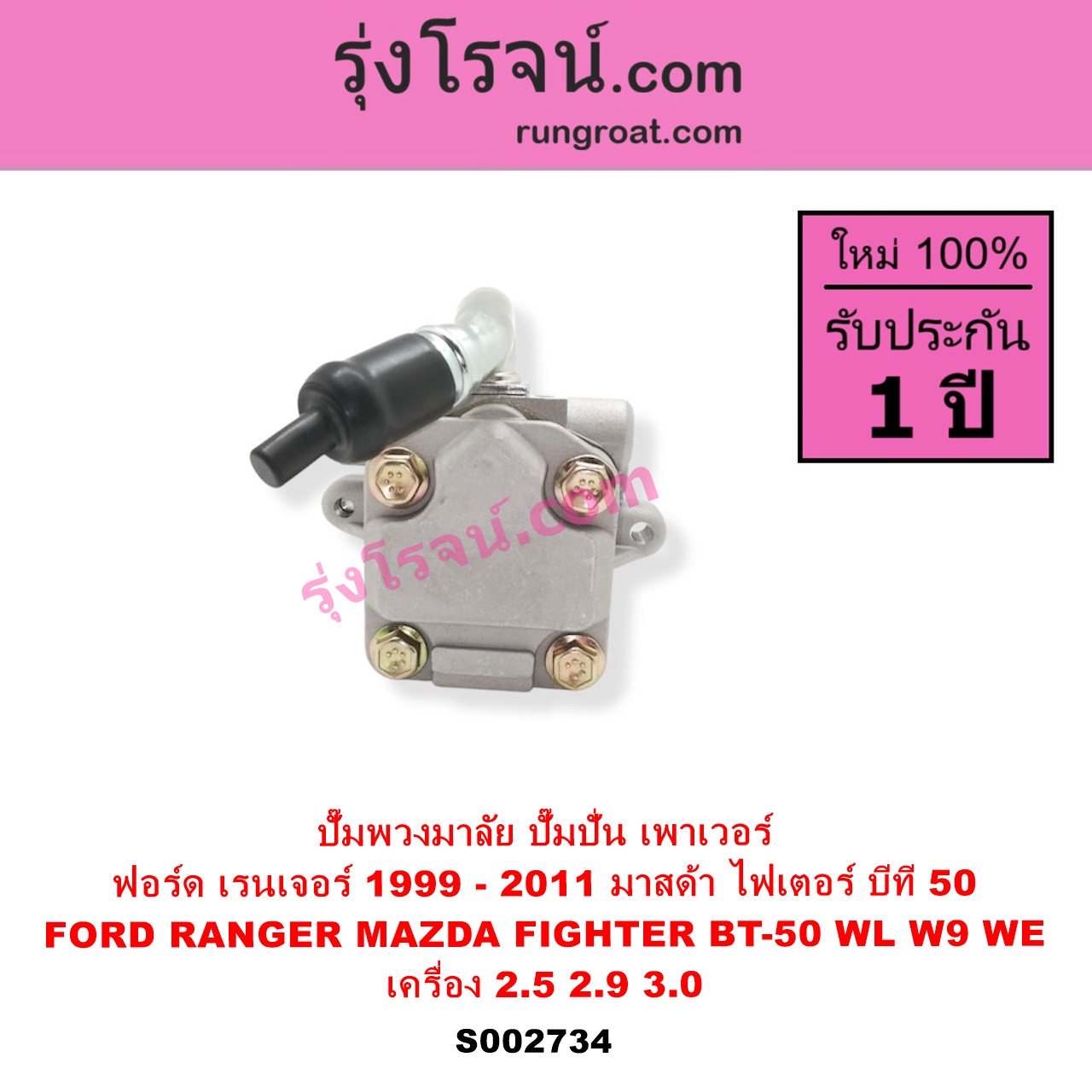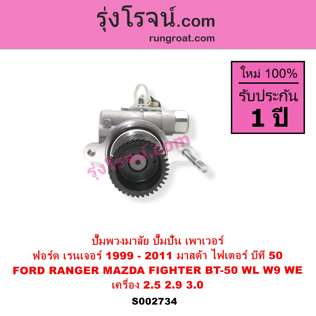 | S002734 | ปั๊มปั่นเพาเวอร์ (ปั๊มพวงมาลัย ตัวปั่น เพาเวอร์) | FORD (ฟอร์ด) / RANGER (เรนเจอร์ 1999 – 2005) (รุ่นแรก WL 12 วาล์ว) , FORD (ฟอร์ด) / RANGER (เรนเจอร์ ดูราทอร์ค 2006 – 2011) (รุ่น 2) , MAZDA (มาสด้า) / BT-50 (บีที 50 06/09) , MAZDA (มาสด้า) / FIGHTER (ไฟเตอร์ 1997 – 2005) |