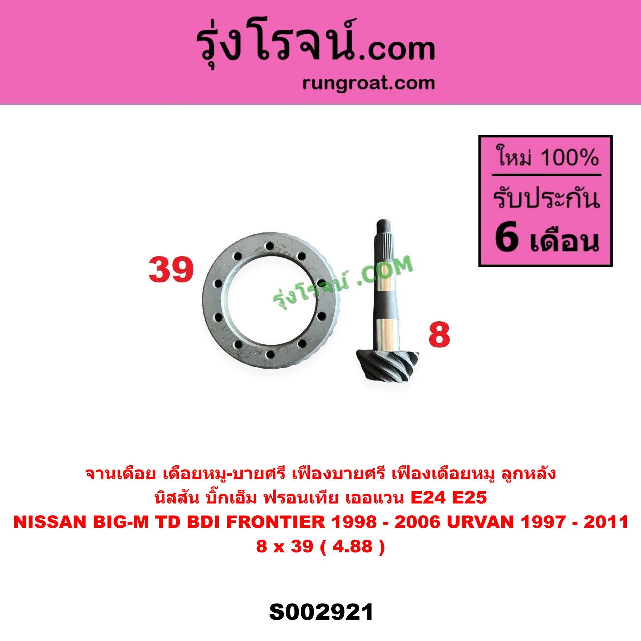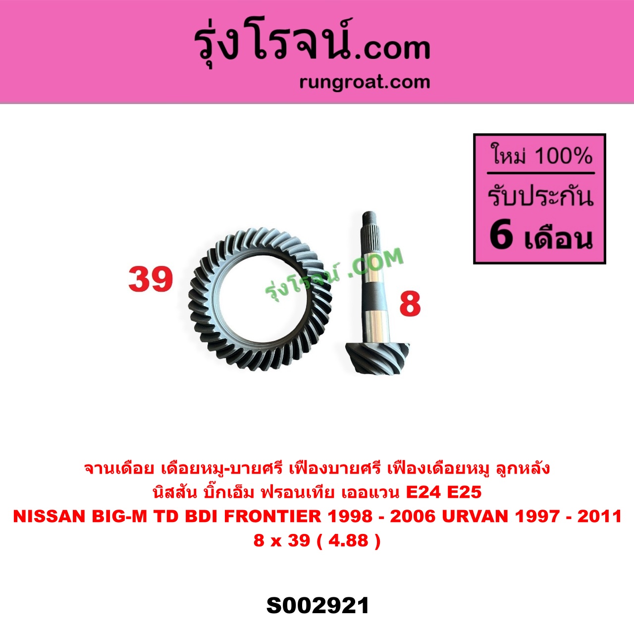 | S002921 | จานเดือย (เดือยหมู-บายศรี, เฟืองบายศรี เฟืองเดือยหมู) | NISSAN (นิสสัน) / BIG-M (บิ๊กเอ็ม TD, BDI / 925 / 993) , NISSAN (นิสสัน) / FRONTIER (ฟรอนเทีย 1998 – 2006) , NISSAN (นิสสัน) / URVAN (เออแวน E24 1997 – 2000) , NISSAN (นิสสัน) / URVAN (เออแวน E25 2001 – 2011) |