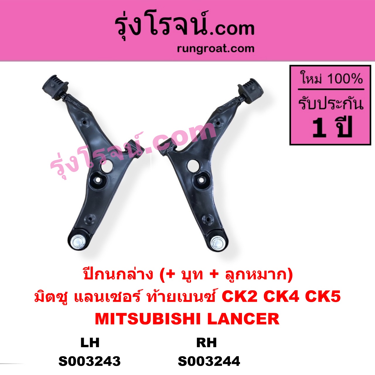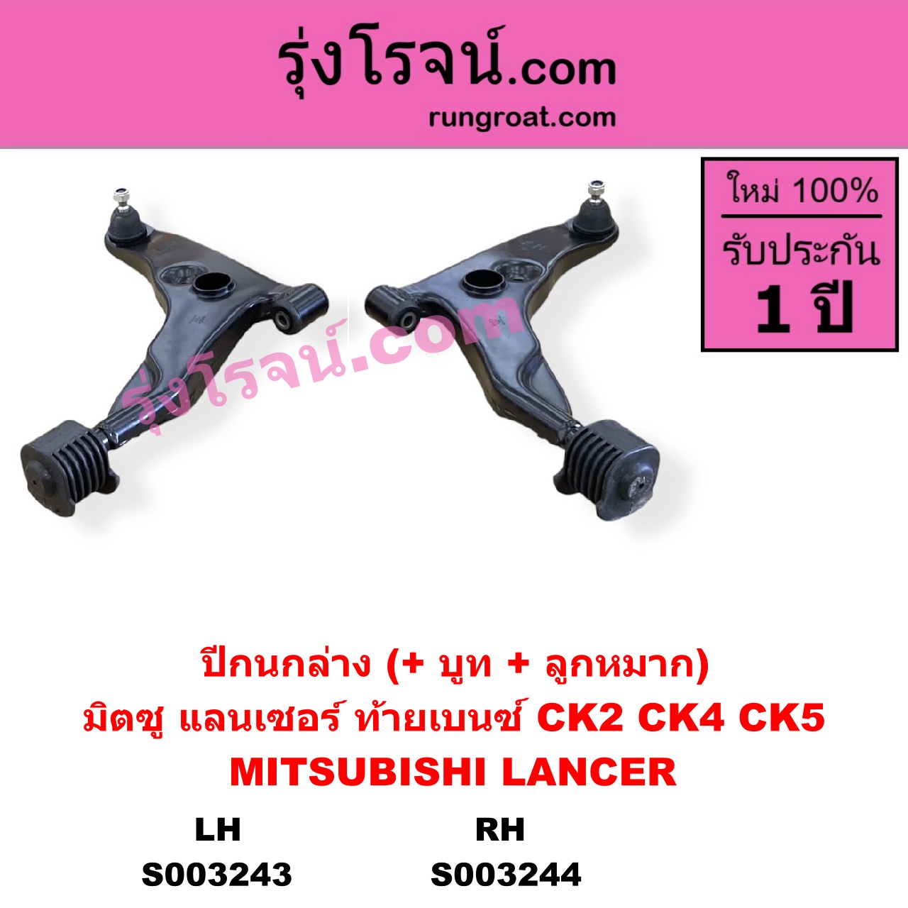 | S003244 | ปีกนกล่าง (+ บูท + ลูกหมาก) | MITSUBISHI (มิตซู) / LANCER CK2/CK4/CK5 (แลนเซอร์ ท้ายเบนซ์) | RH | ไต้หวัน (ใหม่) |