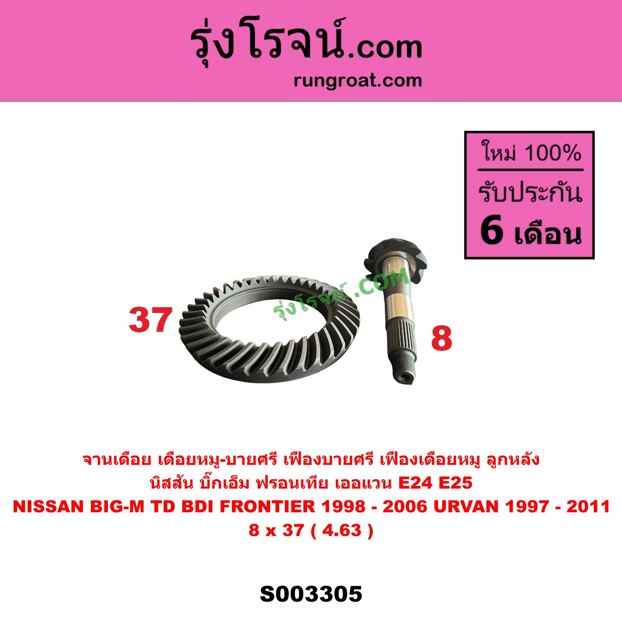 | S003305 | จานเดือย (เดือยหมู-บายศรี, เฟืองบายศรี เฟืองเดือยหมู) | NISSAN (นิสสัน) / BIG-M (บิ๊กเอ็ม TD, BDI / 925 / 993) , NISSAN (นิสสัน) / FRONTIER (ฟรอนเทีย 1998 – 2006) , NISSAN (นิสสัน) / URVAN (เออแวน E24 1997 – 2000) , NISSAN (นิสสัน) / URVAN (เออแวน E25 2001 – 2011) |