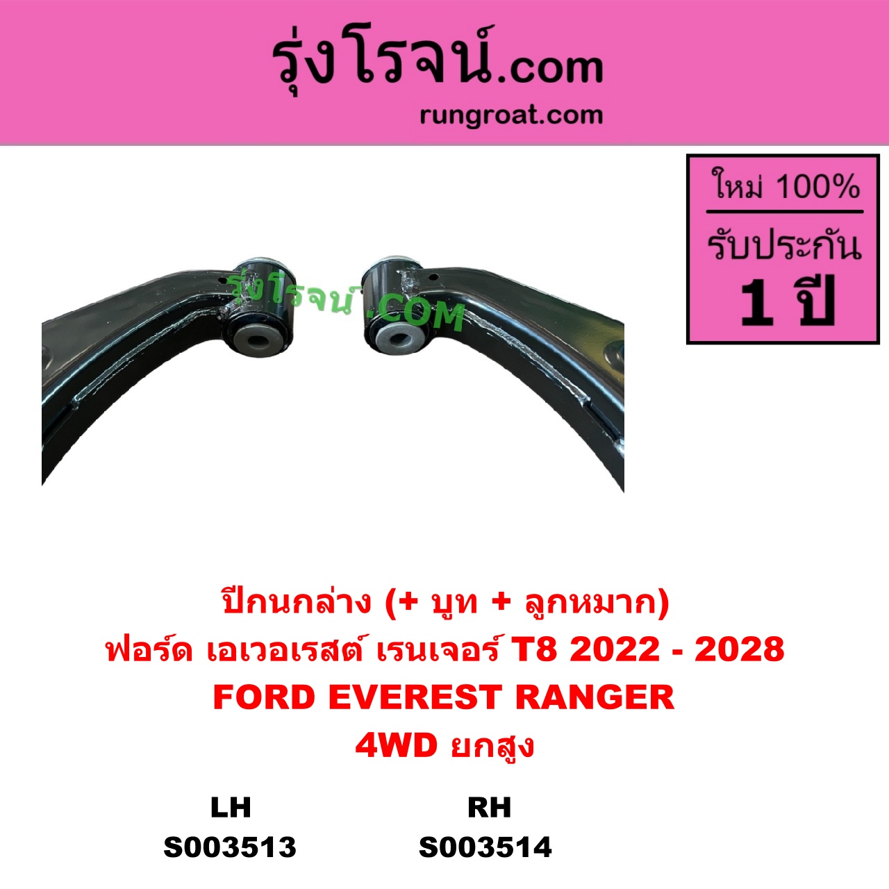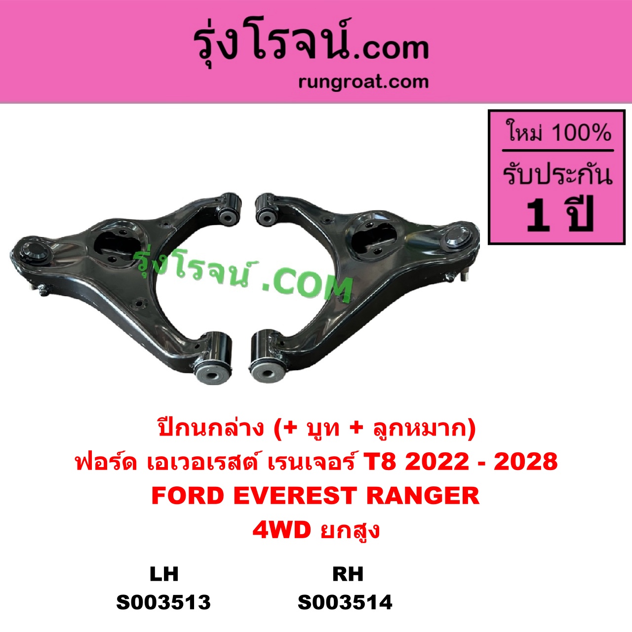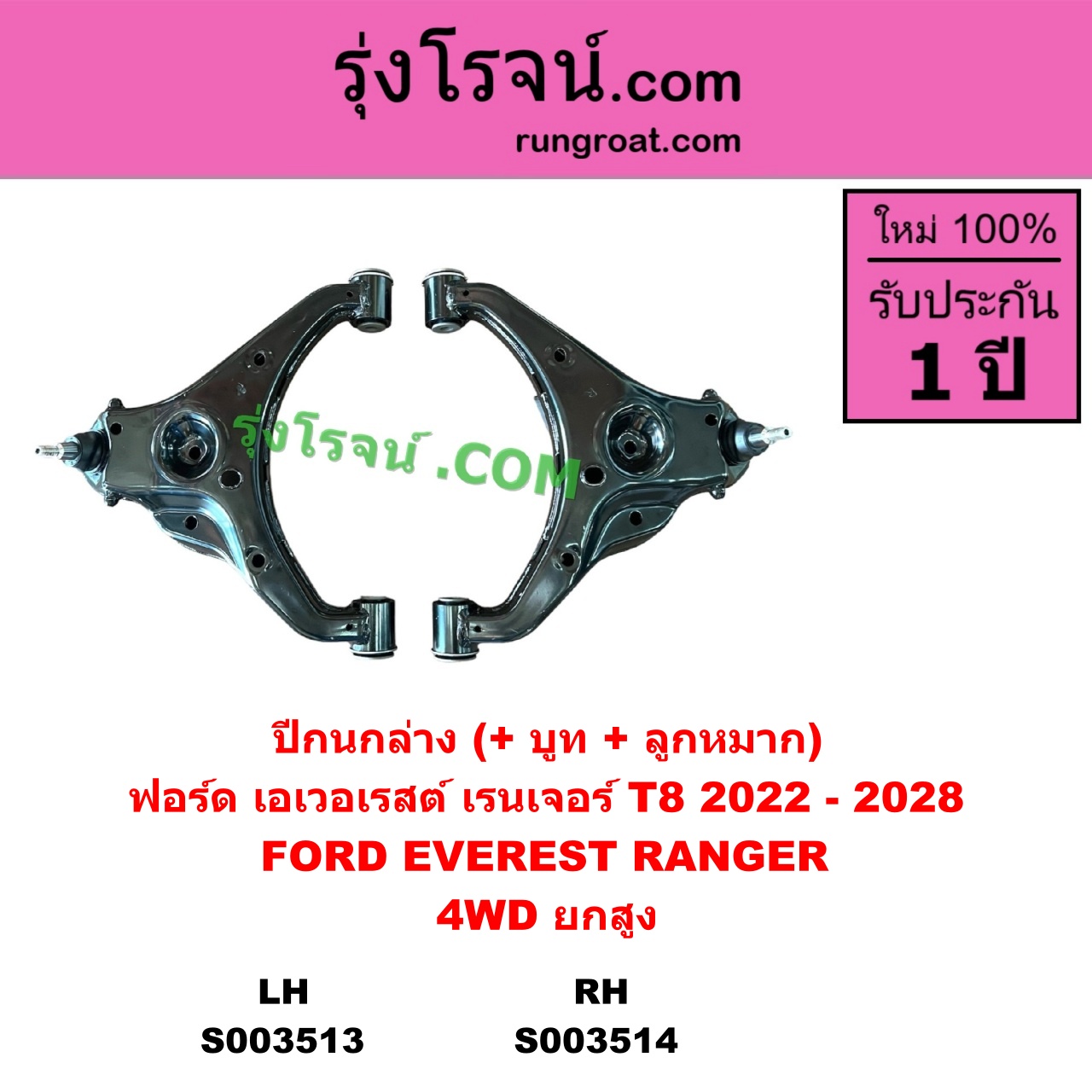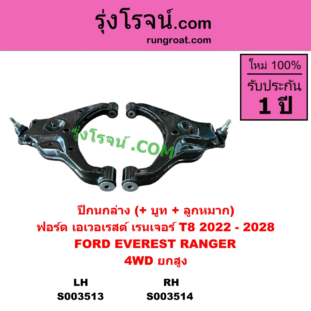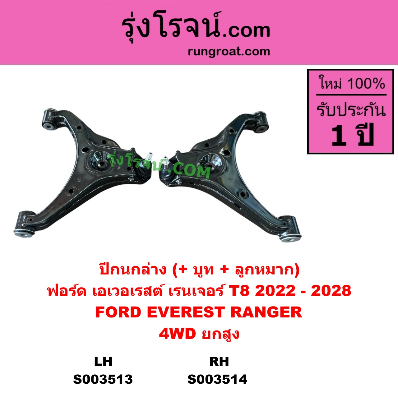 | S003514 | ปีกนกล่าง (+ บูท + ลูกหมาก) | FORD (ฟอร์ด) / EVEREST (เอเวอเรสต์ 2022 – 2028) (T8 รุ่น 4) , FORD (ฟอร์ด) / RANGER (เรนเจอร์ T8 2022 – 2028) (P703) |