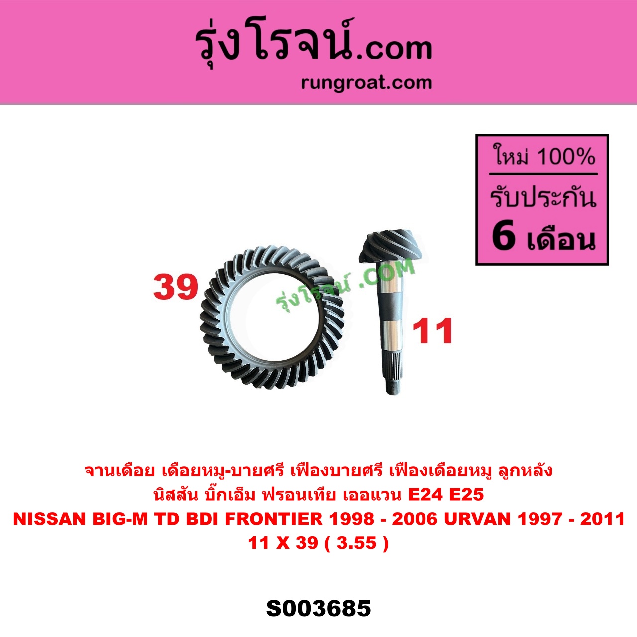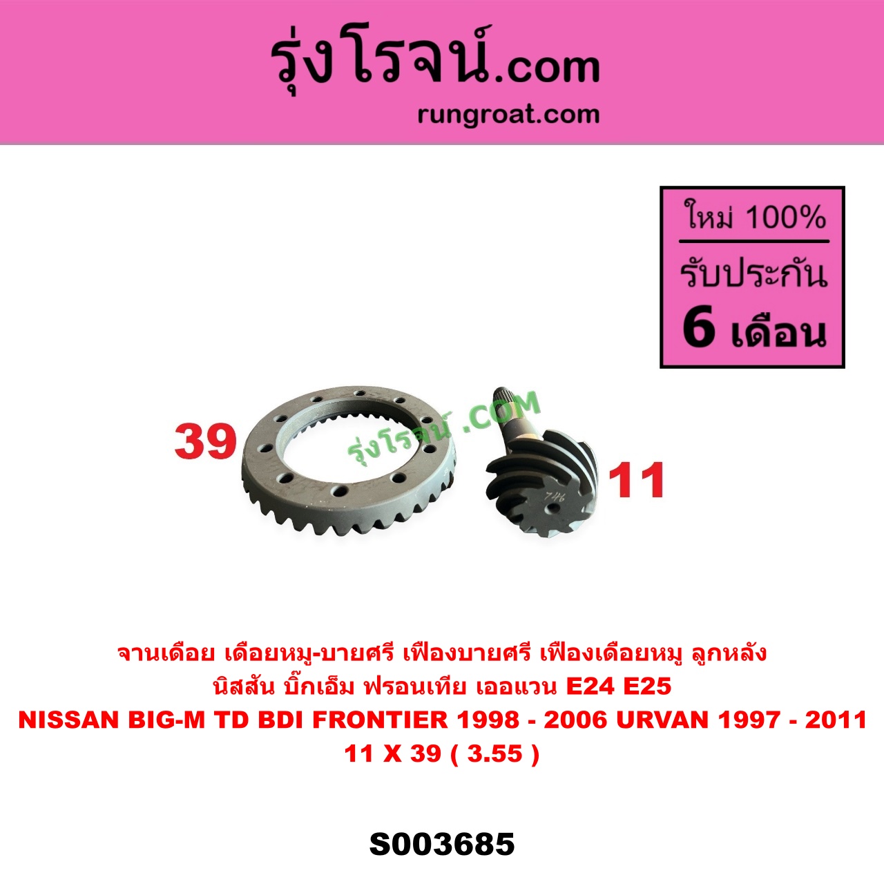 | S003685 | จานเดือย (เดือยหมู-บายศรี, เฟืองบายศรี เฟืองเดือยหมู) | NISSAN (นิสสัน) / BIG-M (บิ๊กเอ็ม TD, BDI / 925 / 993) , NISSAN (นิสสัน) / FRONTIER (ฟรอนเทีย 1998 – 2006) , NISSAN (นิสสัน) / URVAN (เออแวน E24 1997 – 2000) , NISSAN (นิสสัน) / URVAN (เออแวน E25 2001 – 2011) |