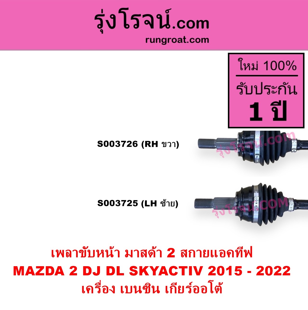 | S003725 | เพลาขับหน้า | MAZDA (มาสด้า) / MAZDA 2 (มาสด้า 2 2015 – 2022) (DJ DL รุ่น 2, สกายแอคทีฟ SKYACTIV) | เครื่อง เบนซิน (เกียร์ออโต้) LH | ไต้หวัน (ใหม่) |