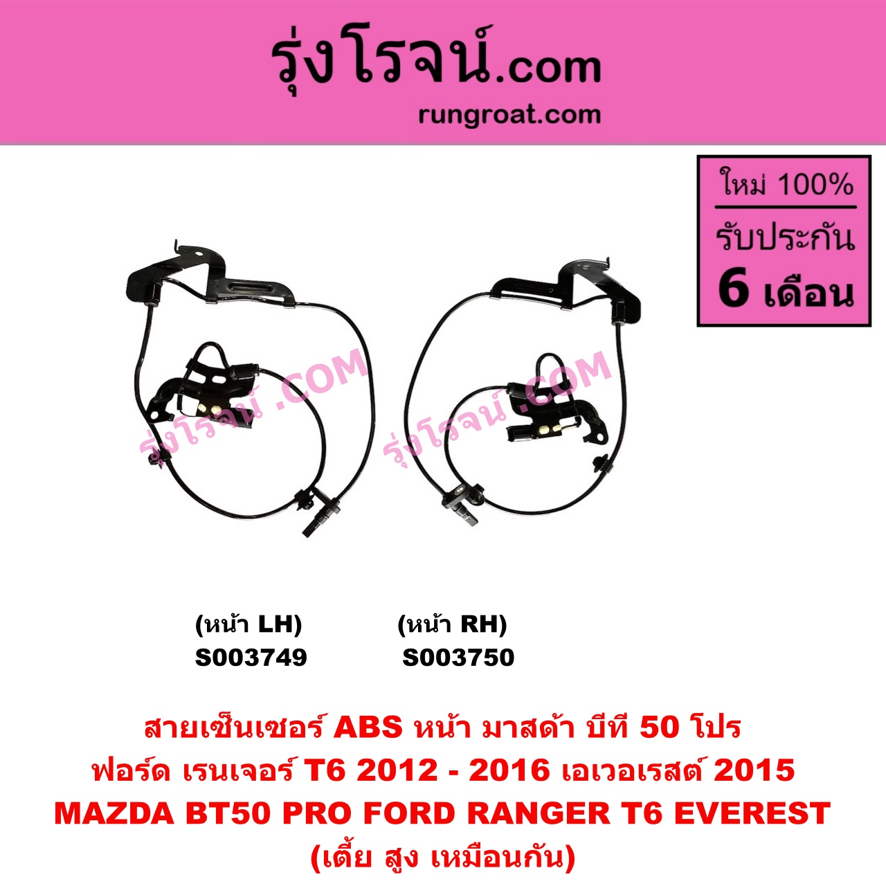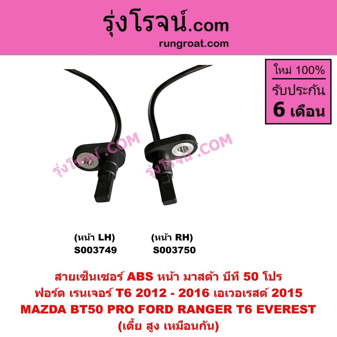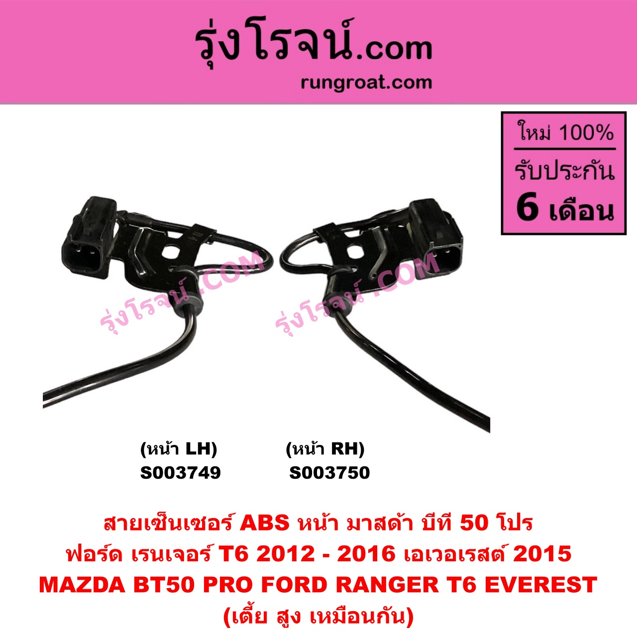 | S003750 | สายเซ็นเซอร์ ABS หน้า | FORD (ฟอร์ด) / EVEREST (เอเวอเรสต์ 2015 – 2021) (T6 T7 รุ่น 3) , FORD (ฟอร์ด) / RANGER (เรนเจอร์ T6 T7 2012 – 2021) (ไวล์ดแทรค แร็ปเตอร์ WILD TRAK RAPTER) , MAZDA (มาสด้า) / BT-50 PRO (บีที 50 โปร 12/15) |