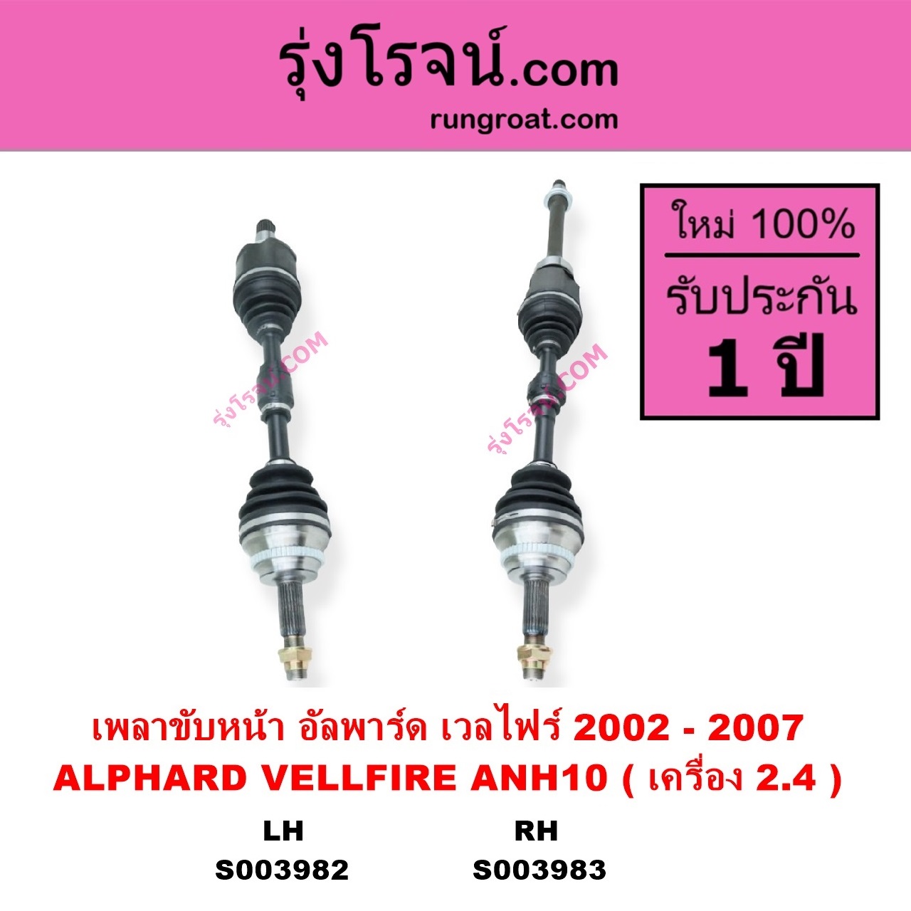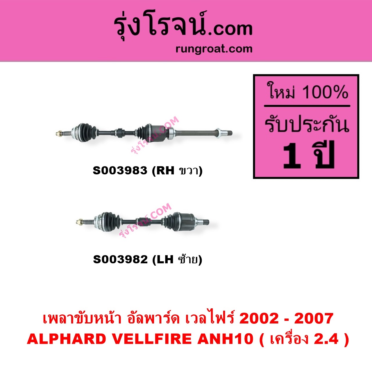 | S003982 | เพลาขับหน้า | TOYOTA (โตโยต้า) / ALPHARD / VELLFIRE (อัลพาร์ด / เวลไฟร์ 2002 – 2007) (AH10 รุ่นแรก) | เครื่อง 2.4 (ANH10) LH | ไต้หวัน (ใหม่) |