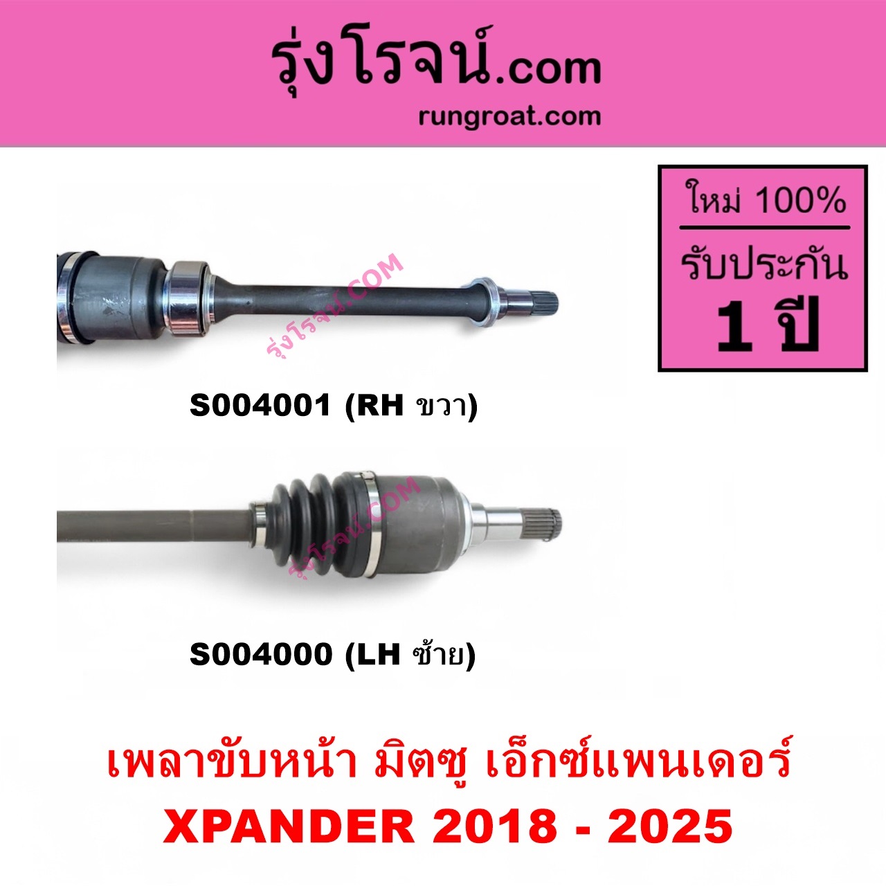 | S004001 | เพลาขับหน้า | MITSUBISHI (มิตซู) / XPANDER, XPANDER CROSS (เอ็กซ์แพนเดอร์ เอ็กเพรสเดอร์ ครอส) (2018 – 2025) | RH | ไต้หวัน (ใหม่) |