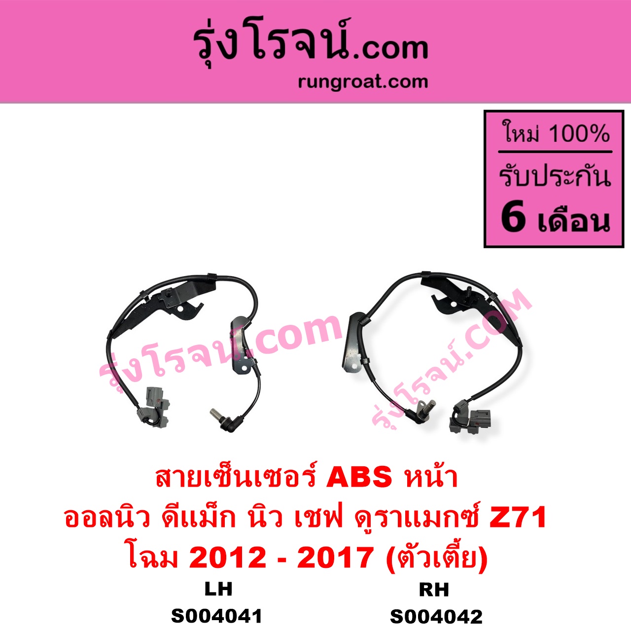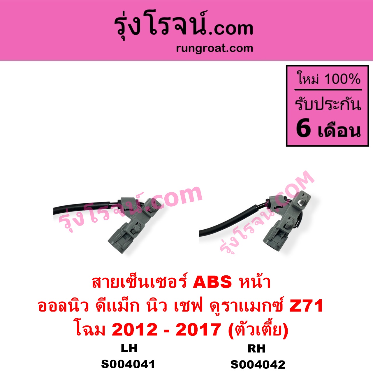 | S004042 | สายเซ็นเซอร์ ABS หน้า | CHEVROLET (เชฟโรเลต) / COLORADO (โคโลราโด 2012 – 2020) (นิว เชฟ ดูราแมกซ์, Z71, DURAMAX) , ISUZU (อีซูซุ) / D-MAX (ออนิว ออลนิว ดีแม็ก ดีแม็ค DMAX 2012 – 2019) (วีครอส V-CROSS / บลูเพาเวอร์ / 1.9) |