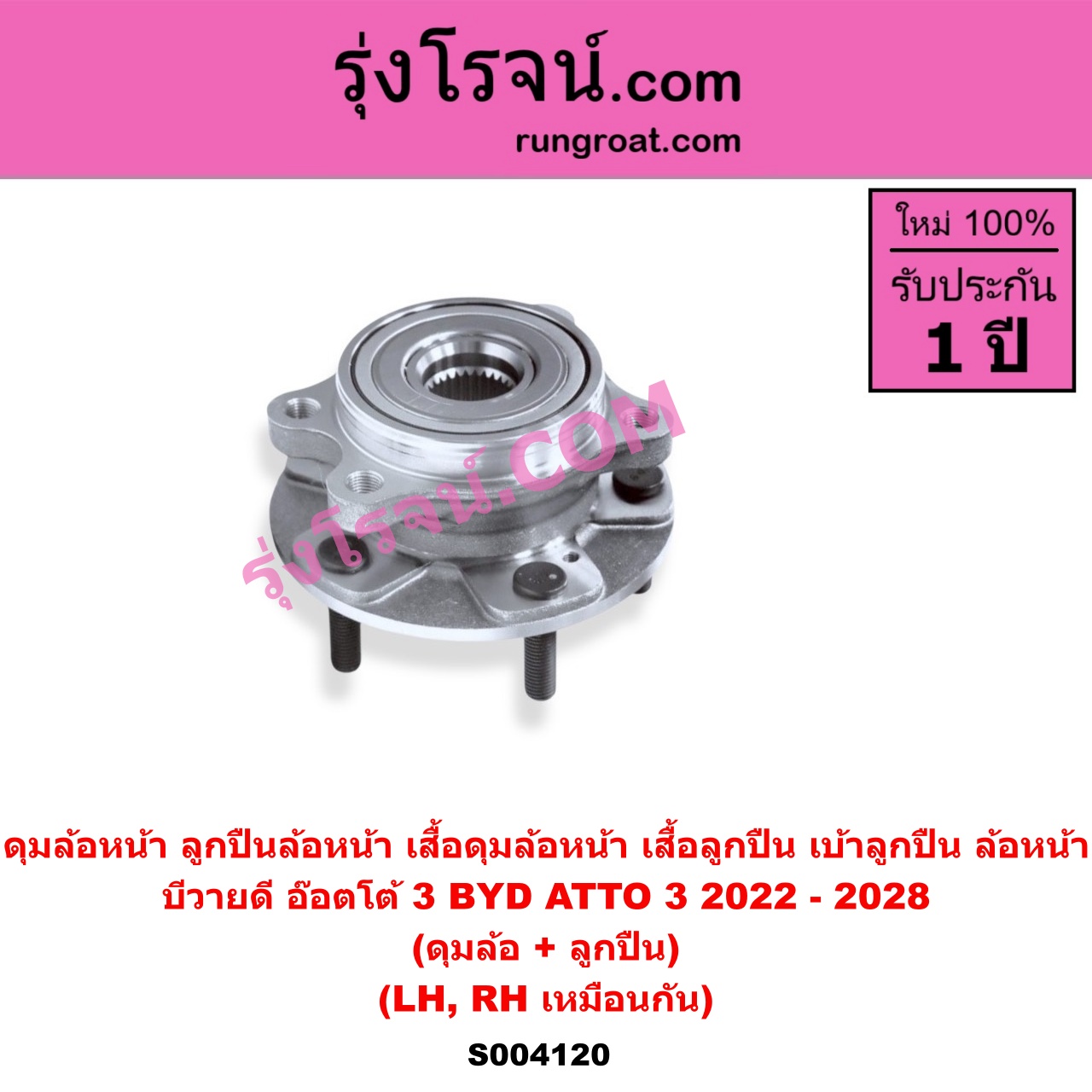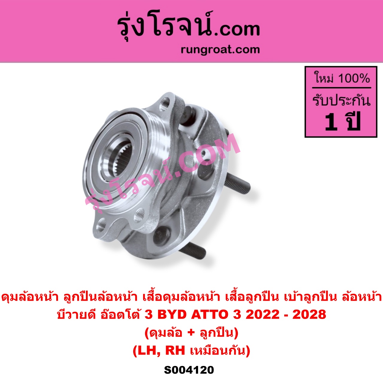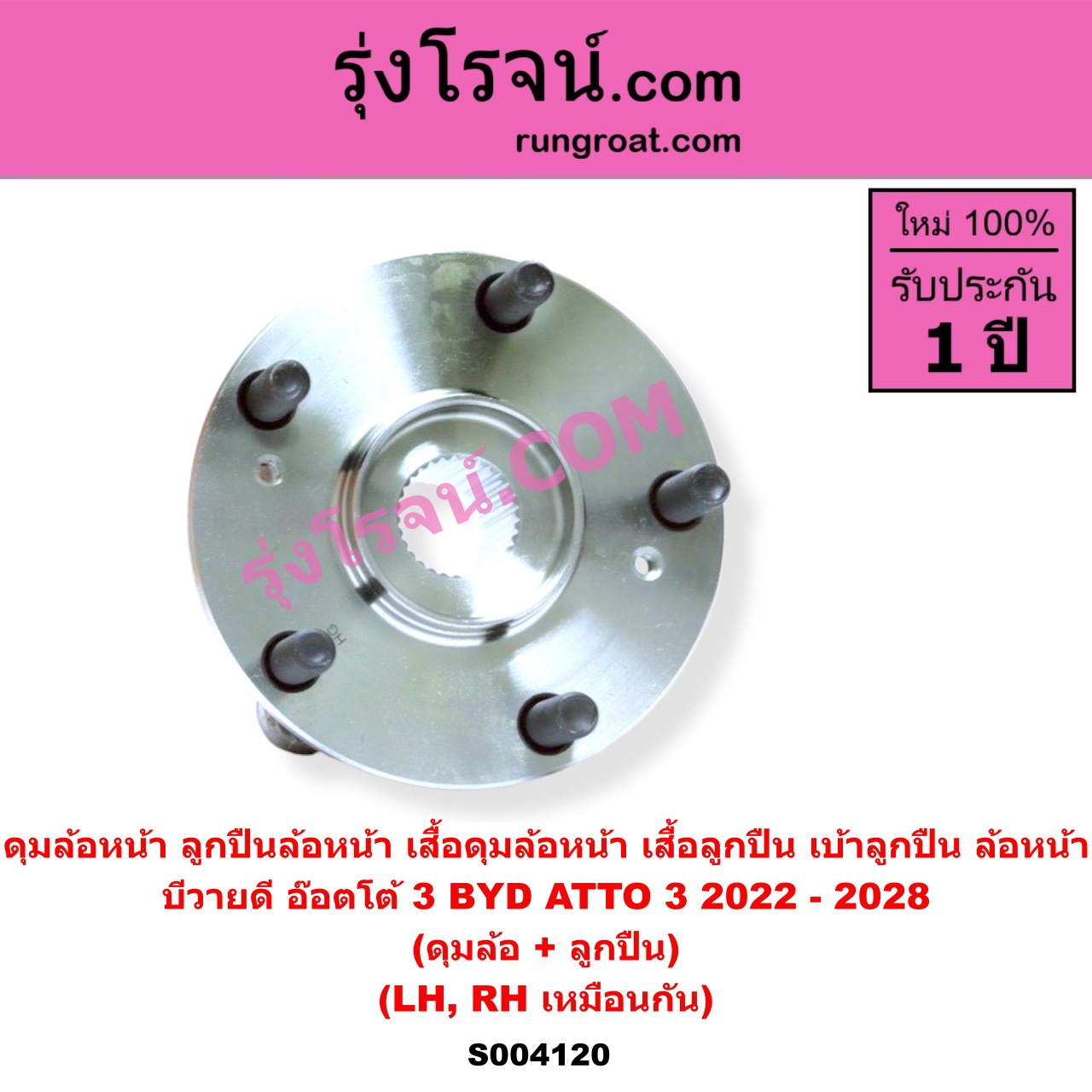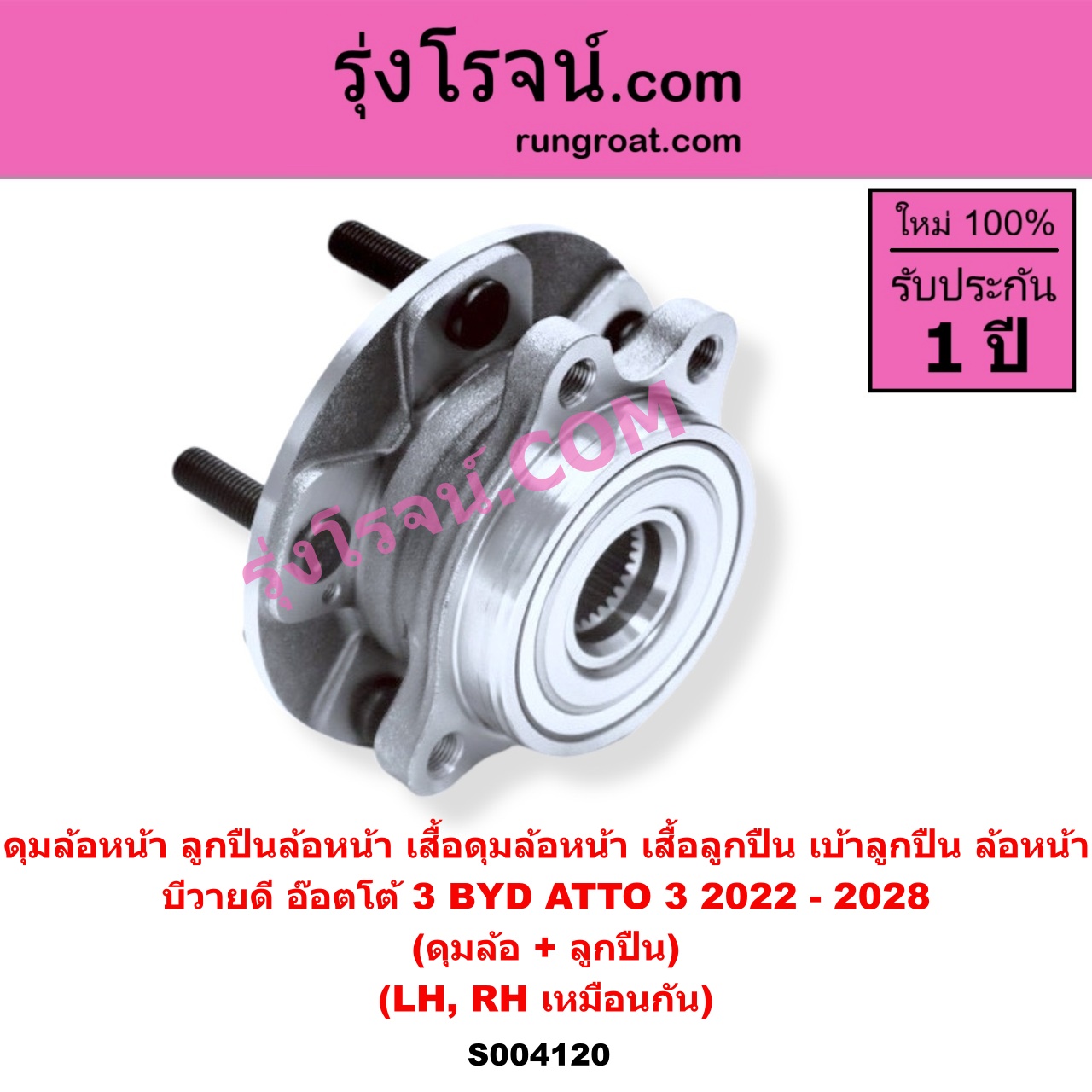 | S004120 | ดุมล้อหน้า (ลูกปืนล้อหน้า, เสื้อดุมล้อหน้า, เสื้อลูกปืน เบ้าลูกปืน ล้อหน้า) | BYD (บีวายดี) / ATTO 3 (อ๊อตโต้ 3) (2022 – 2028) | (เฉพาะ ดุม+ลูกปืน) LH, RH | ไต้หวัน (ใหม่) |