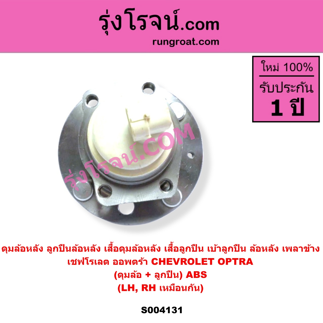 | S004131 | ดุมล้อหลัง (ลูกปืนล้อหลัง, เสื้อดุมล้อหลัง, เสื้อลูกปืน เบ้าลูกปืน ล้อหลัง เพลาข้าง) | CHEVROLET (เชฟโรเลต) / OPTRA (ออพตร้า ออฟตร้า ออฟต้า 2003 – 2013) | (เฉพาะ ดุม+ลูกปืน) ABS LH, RH | ไต้หวัน (ใหม่) |