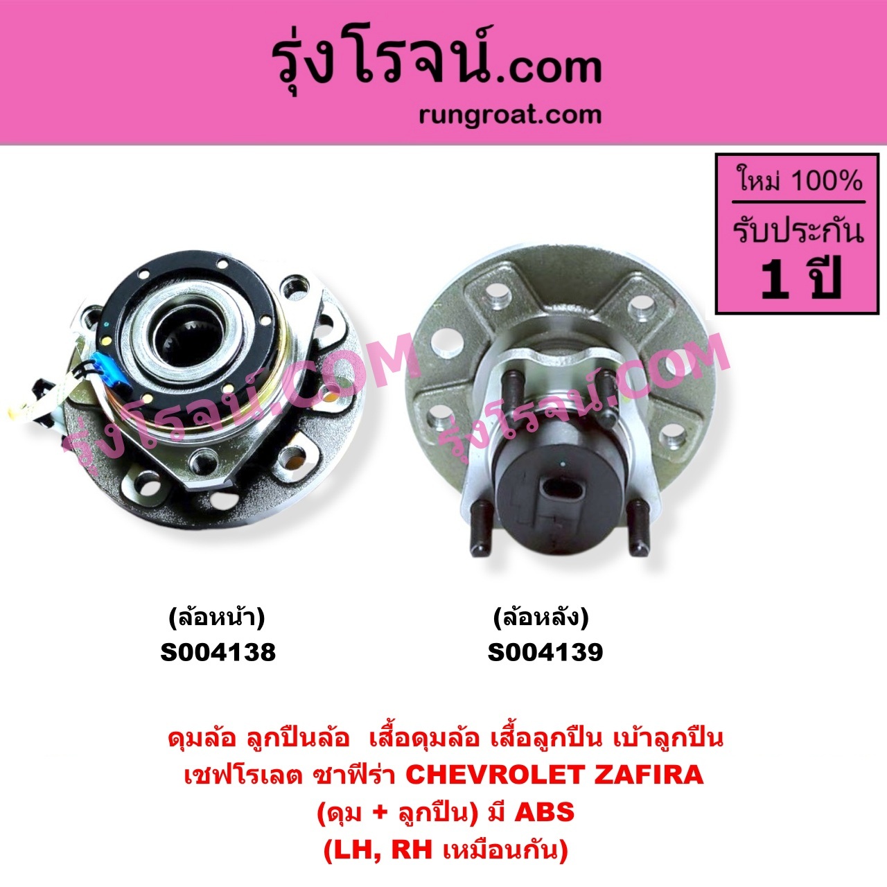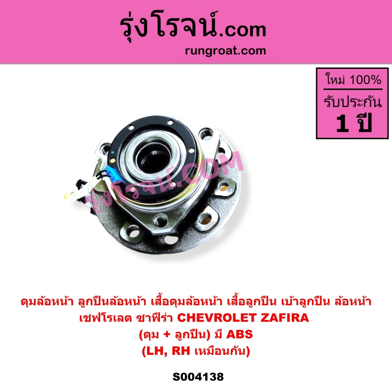 | S004138 | ดุมล้อหน้า (ลูกปืนล้อหน้า, เสื้อดุมล้อหน้า, เสื้อลูกปืน เบ้าลูกปืน ล้อหน้า) | CHEVROLET (เชฟโรเลต) / ZAFIRA (ซาฟีร่า) | (ดุม + ลูกปืน) ABS LH, RH | ไต้หวัน (ใหม่) |