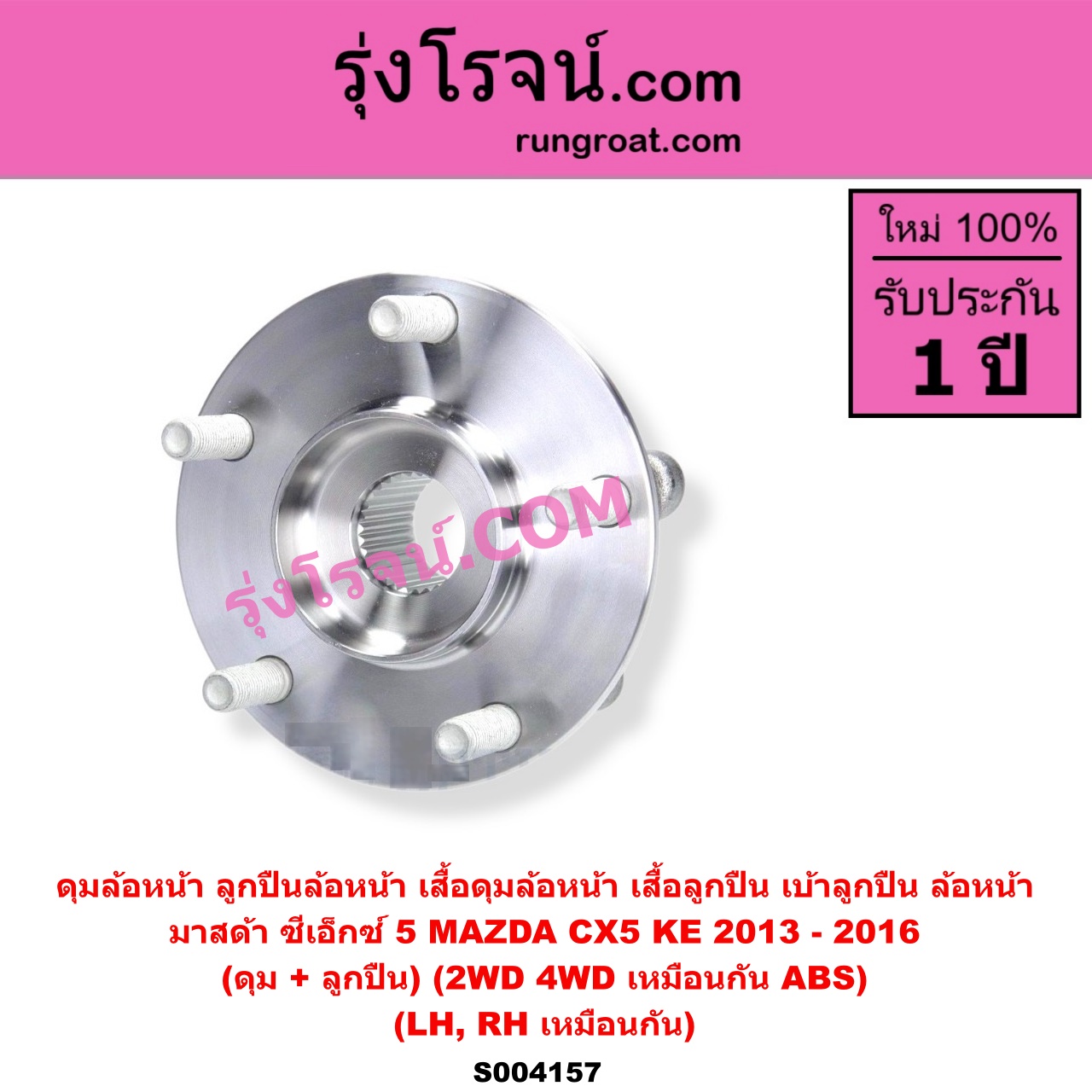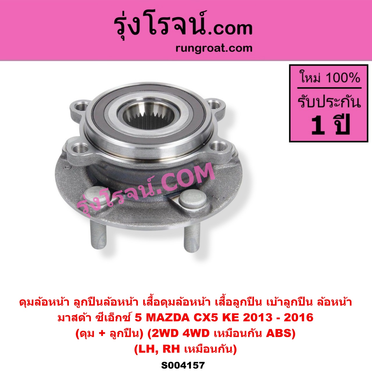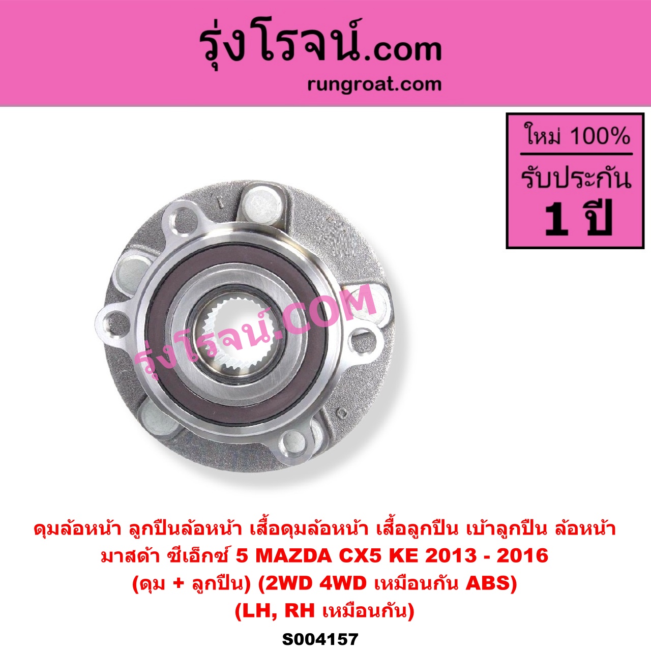 | S004157 | ดุมล้อหน้า (ลูกปืนล้อหน้า, เสื้อดุมล้อหน้า, เสื้อลูกปืน เบ้าลูกปืน ล้อหน้า) | MAZDA (มาสด้า) / CX-5 (ซีเอ็กซ์ 5) (KE 2013 – 2016) | (ดุม + ลูกปืน) ABS LH, RH | ไต้หวัน (ใหม่) |