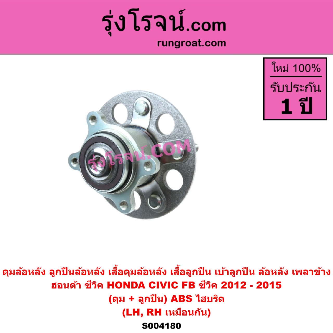 S004180 ดุมล้อหลัง (ลูกปืนล้อหลัง, เสื้อดุมล้อหลัง, เสื้อลูกปืน เบ้าลูกปืน ล้อหลัง เพลาข้าง) HONDA (ฮอนด้า) / CIVIC (ซีวิค 2012 – 2015 ไฮบริด) (FB) (ดุม + ลูกปืน) ABS ไฮบริด LH, RH ไต้หวัน (ใหม่)