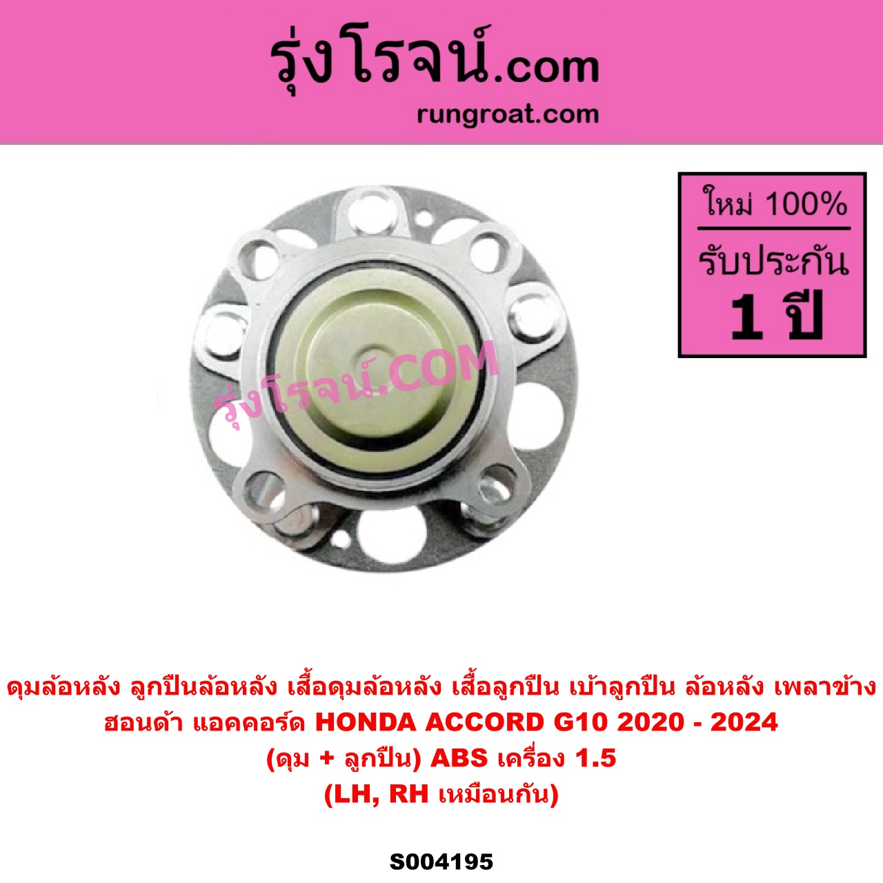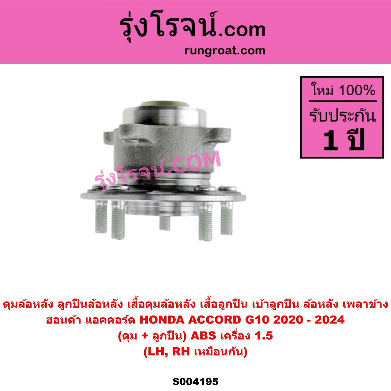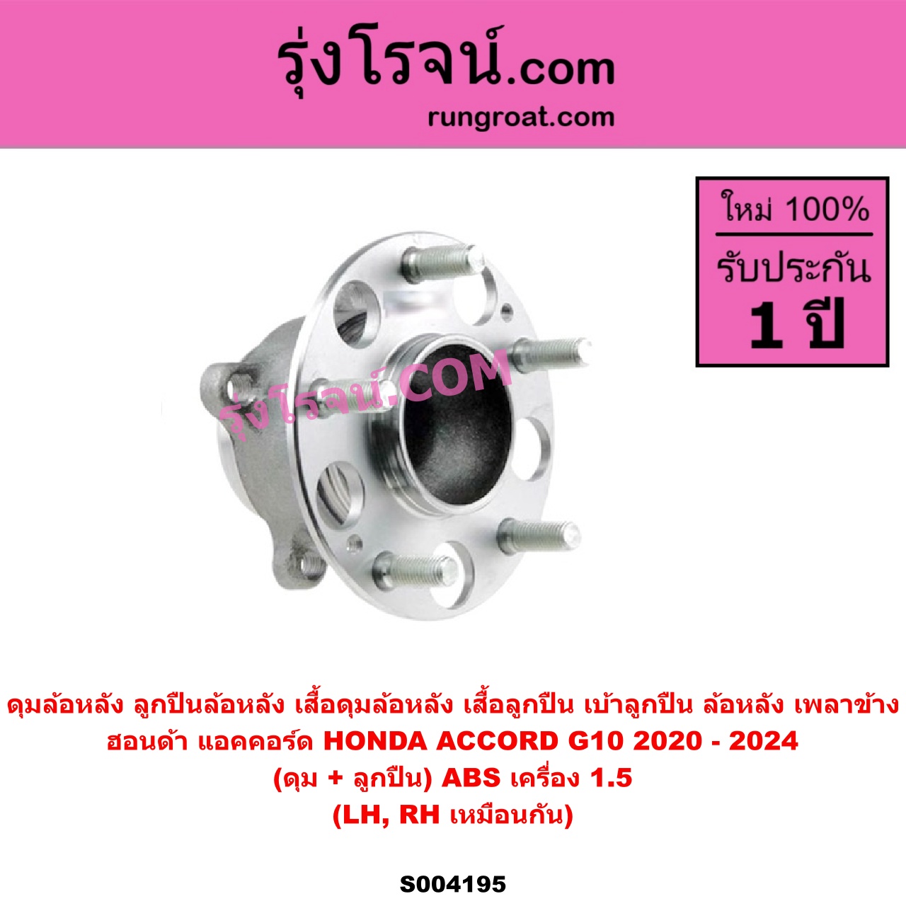| S004195 | ดุมล้อหลัง (ลูกปืนล้อหลัง, เสื้อดุมล้อหลัง, เสื้อลูกปืน เบ้าลูกปืน ล้อหลัง เพลาข้าง) | HONDA (ฮอนด้า) / ACCORD (แอคคอร์ด 2020 – 2024) (G10) (CV1 CV2 CV3) | (ดุม + ลูกปืน) ABS เครื่อง 1.5 LH, RH | ไต้หวัน (ใหม่) |