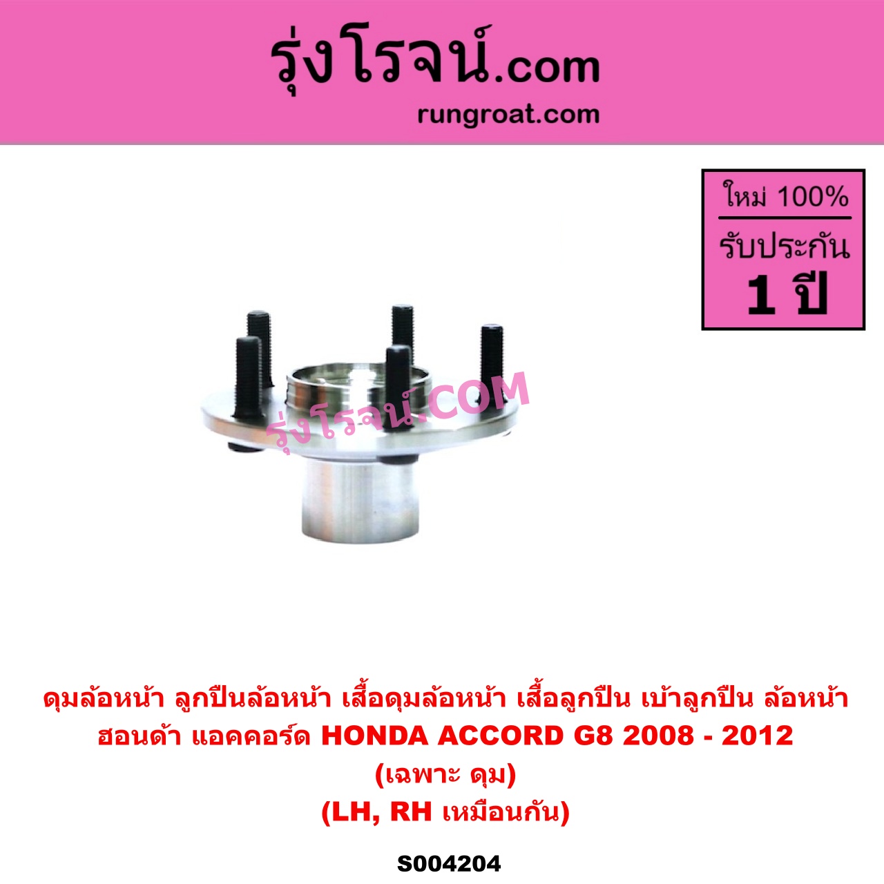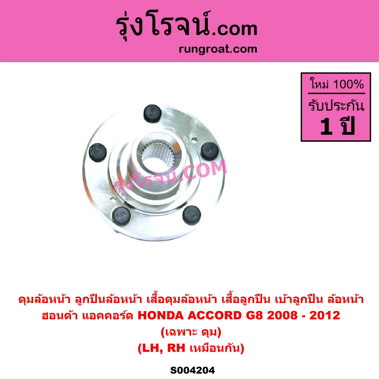 | S004204 | ดุมล้อหน้า (ลูกปืนล้อหน้า, เสื้อดุมล้อหน้า, เสื้อลูกปืน เบ้าลูกปืน ล้อหน้า) | HONDA (ฮอนด้า) / ACCORD (แอคคอร์ด 2008 – 2012) (G8) | (เฉพาะ ดุม) LH, RH | ไต้หวัน (ใหม่) |