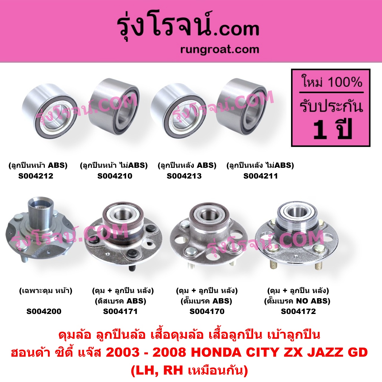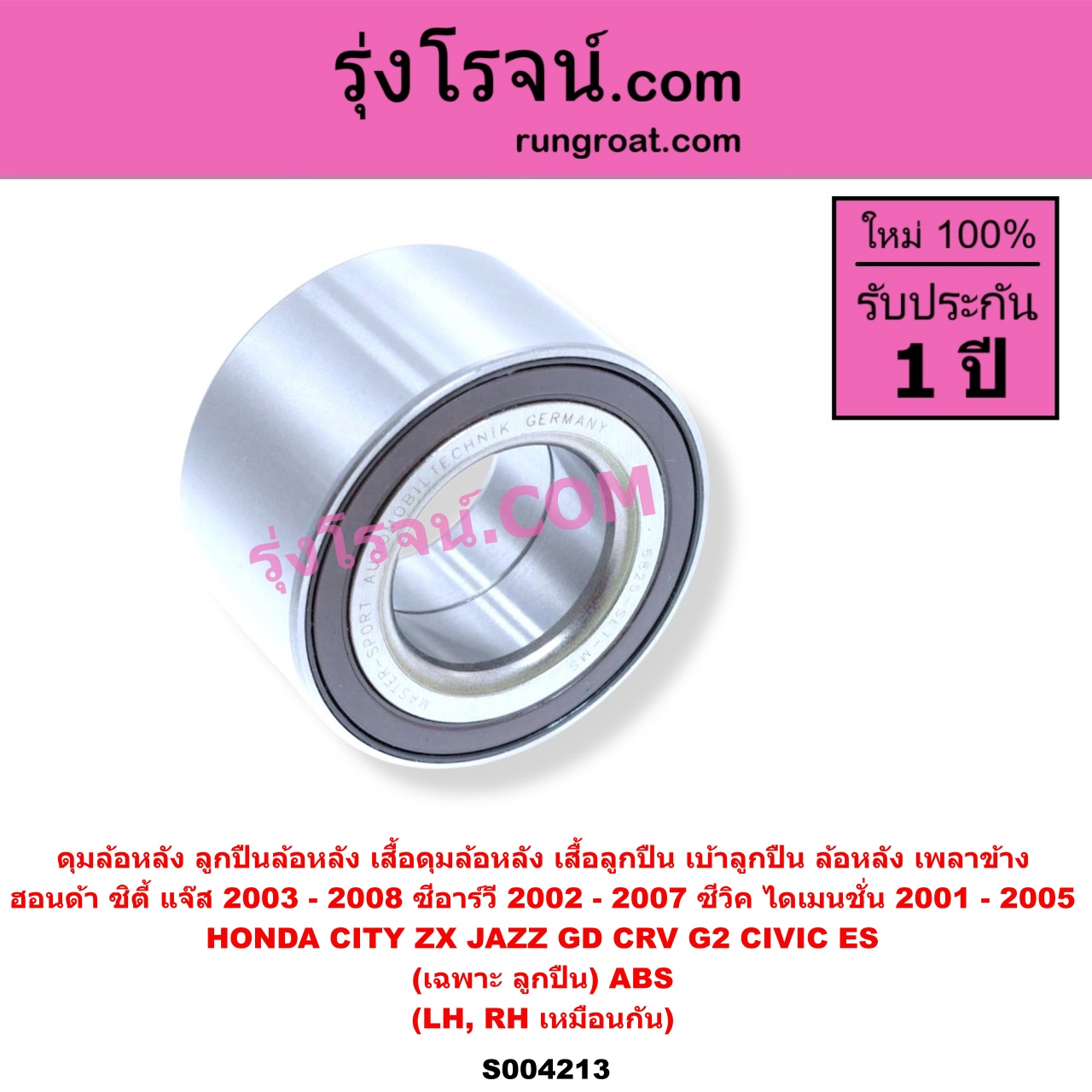 | S004213 | ดุมล้อหลัง (ลูกปืนล้อหลัง, เสื้อดุมล้อหลัง, เสื้อลูกปืน เบ้าลูกปืน ล้อหลัง เพลาข้าง) | HONDA (ฮอนด้า) / CITY (ซิตี้ 2003 – 2008) (แมลงสาบ, ZX) , HONDA (ฮอนด้า) / CIVIC (ซีวิค 2001 – 2005) (ไดเมนชั่น) (ES) , HONDA (ฮอนด้า) / CRV (ซีอาร์วี 2002 – 2007) (G2 ไฟท้ายยาว) , HONDA (ฮอนด้า) / JAZZ (แจ๊ส 2003 – 2008) (GD) |