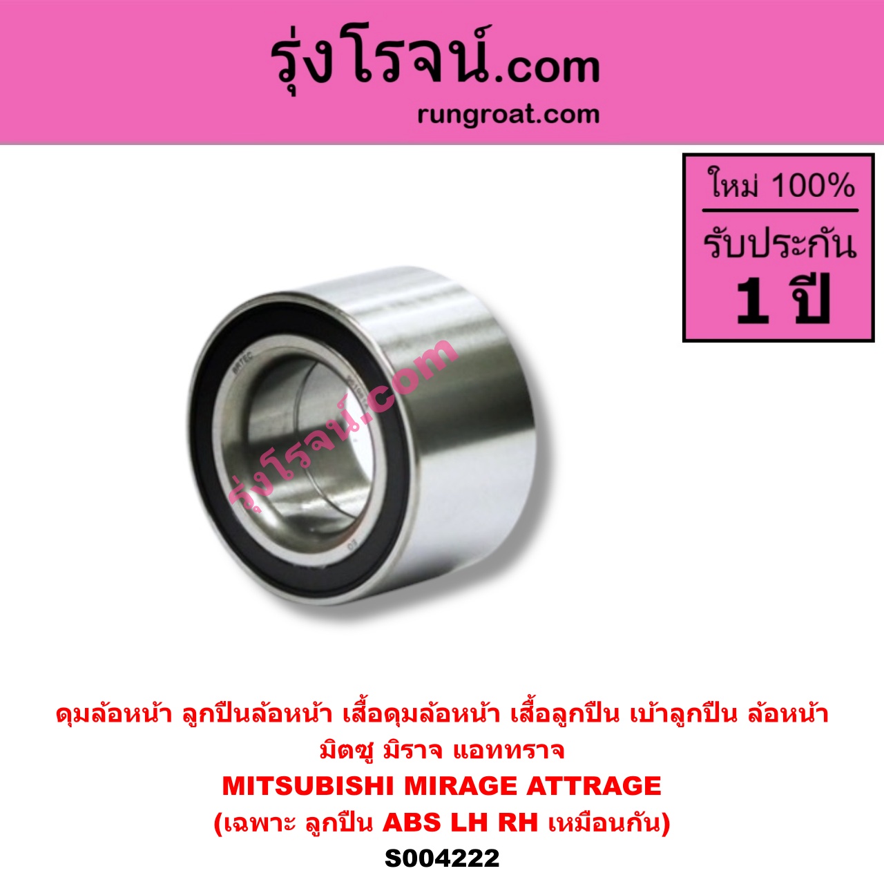 | S004222 | ดุมล้อหน้า (ลูกปืนล้อหน้า, เสื้อดุมล้อหน้า, เสื้อลูกปืน เบ้าลูกปืน ล้อหน้า) | MITSUBISHI (มิตซู) / ATTRAGE (แอททราจ 2014 – 2023) , MITSUBISHI (มิตซู) / MIRAGE (มิราจ 2012 – 2023) |