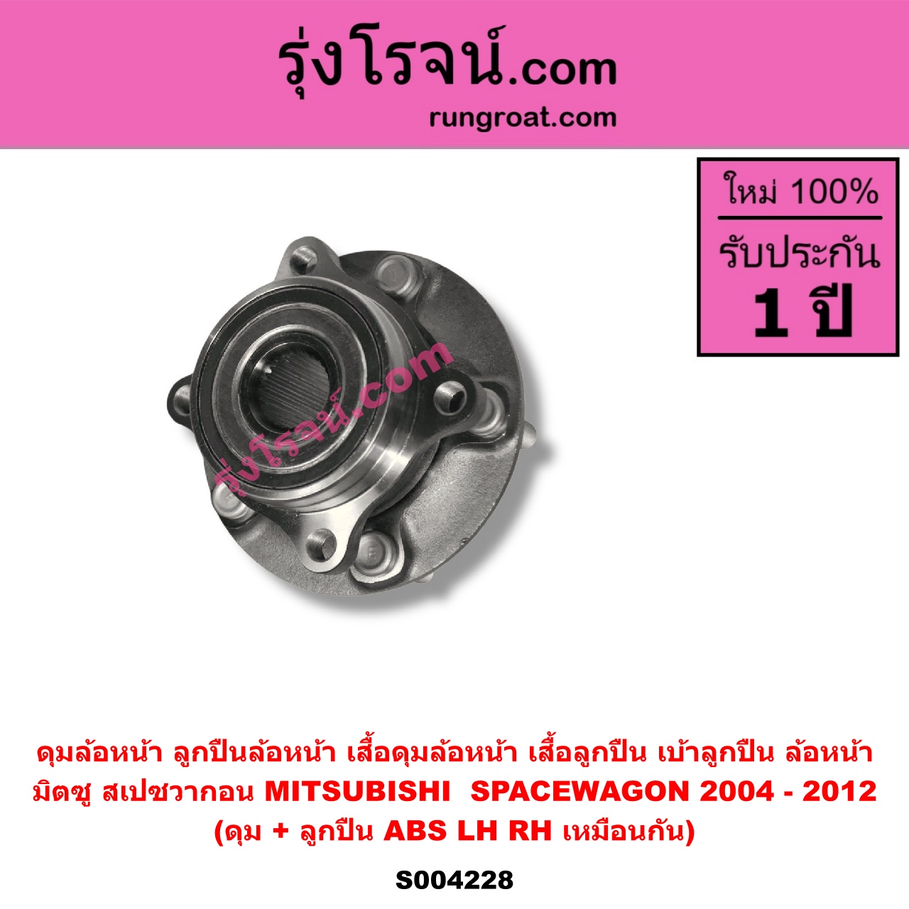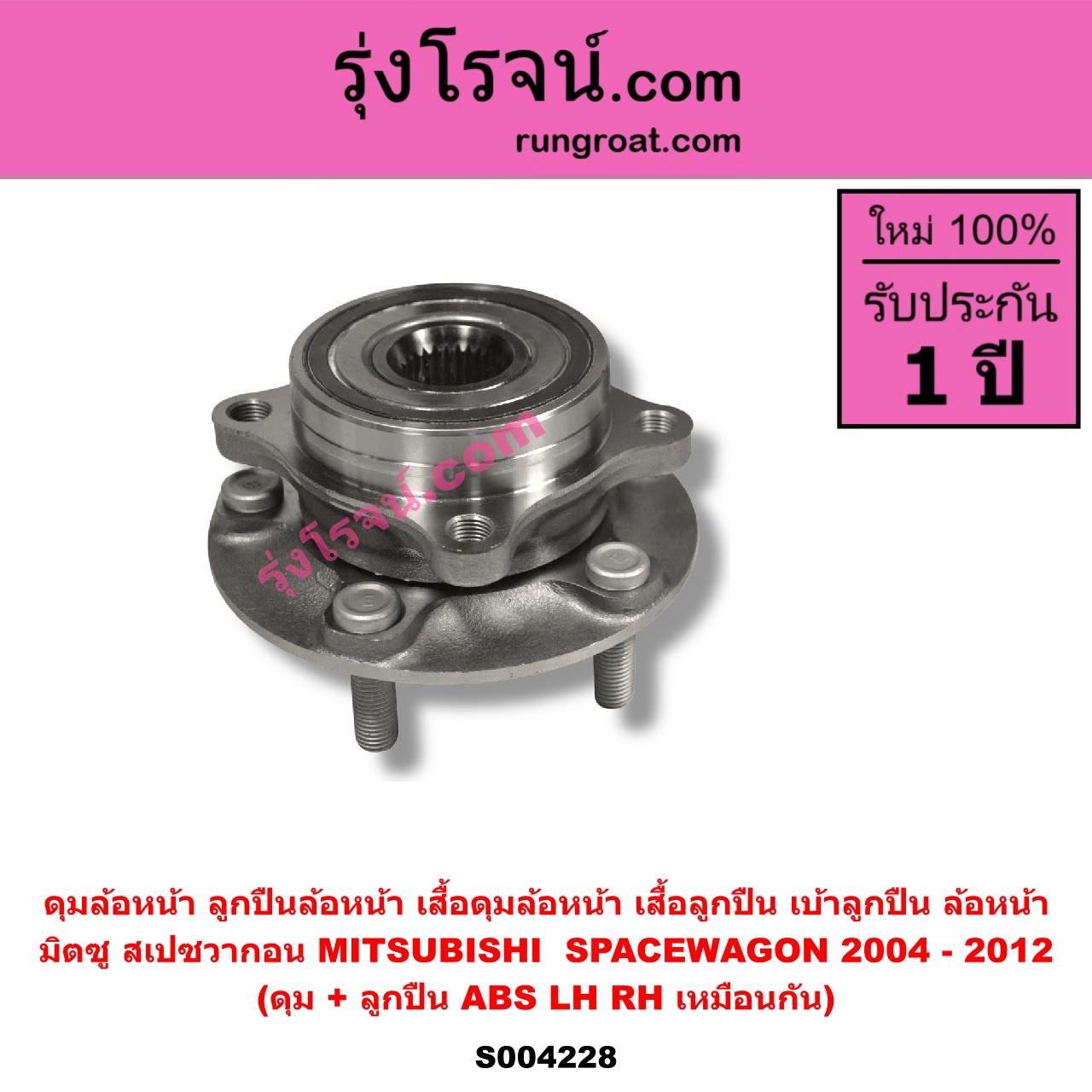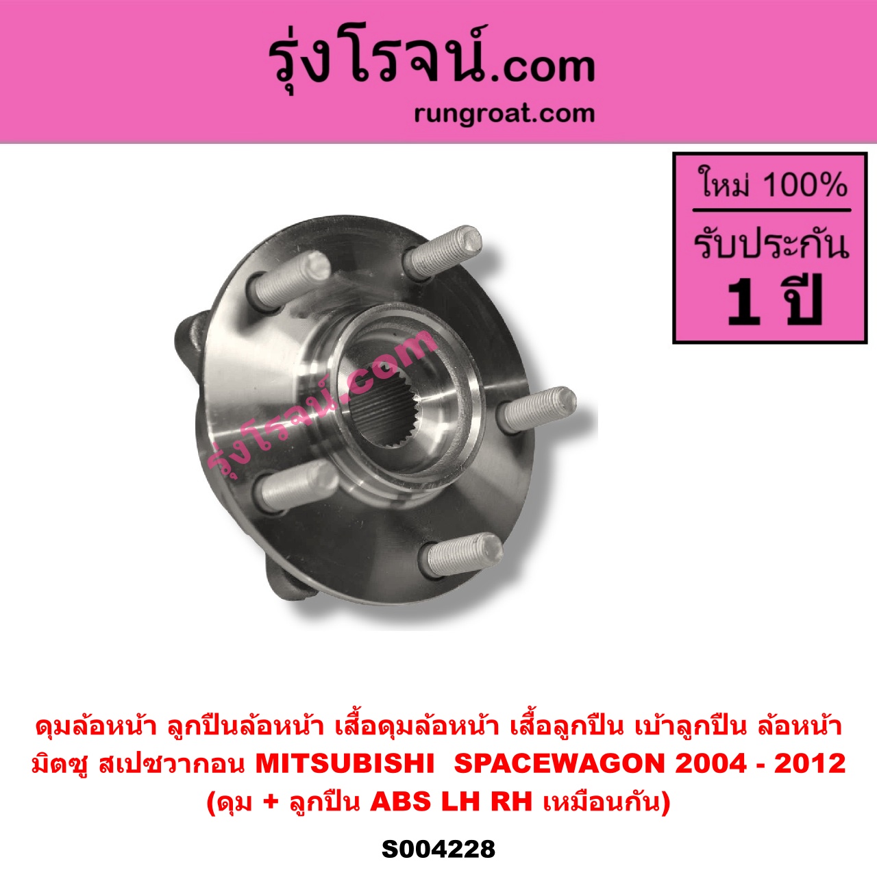 | S004228 | ดุมล้อหน้า (ลูกปืนล้อหน้า, เสื้อดุมล้อหน้า, เสื้อลูกปืน เบ้าลูกปืน ล้อหน้า) | MITSUBISHI (มิตซู) / SPACEWAGON (สเปซวากอน 2004 – 2012) (รุ่น 2) | (ดุม + ลูกปืน) ABS LH, RH | ไต้หวัน (ใหม่) |