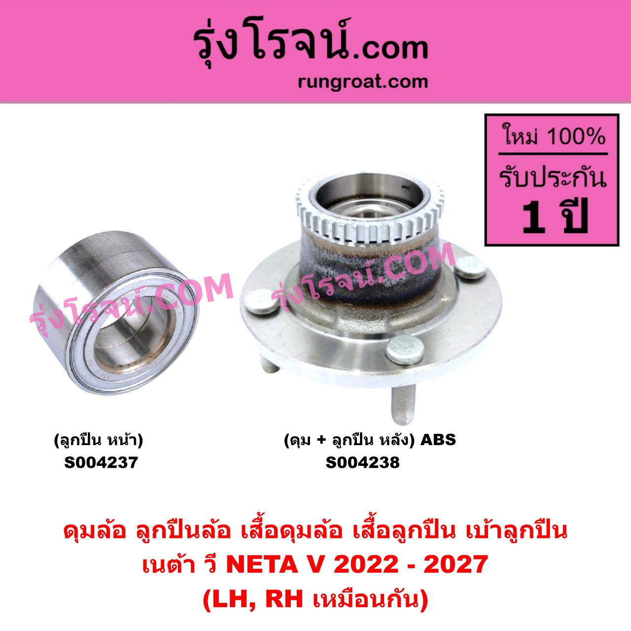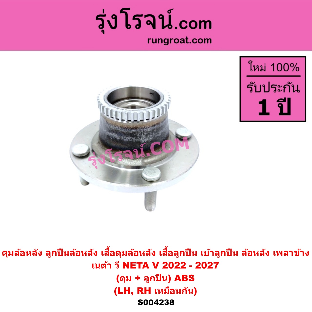 | S004238 | ดุมล้อหลัง (ลูกปืนล้อหลัง, เสื้อดุมล้อหลัง, เสื้อลูกปืน เบ้าลูกปืน ล้อหลัง เพลาข้าง) | NETA (เนต้า) / NETA V (เนต้า วี) (2022 – 2027) | (ดุม + ลูกปืน) ABS LH, RH | ไต้หวัน (ใหม่) |