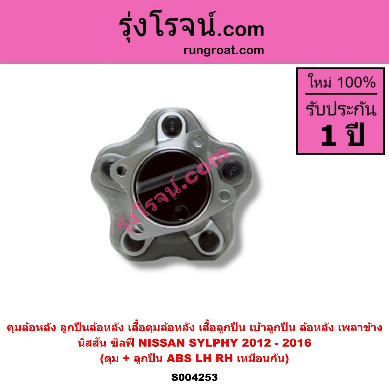 | S004253 | ดุมล้อหลัง (ลูกปืนล้อหลัง, เสื้อดุมล้อหลัง, เสื้อลูกปืน เบ้าลูกปืน ล้อหลัง เพลาข้าง) | NISSAN (นิสสัน) / SYLPHY (ซิลฟี่ 2012 – 2016) | (ดุม + ลูกปืน) ABS LH, RH | ไต้หวัน (ใหม่) |