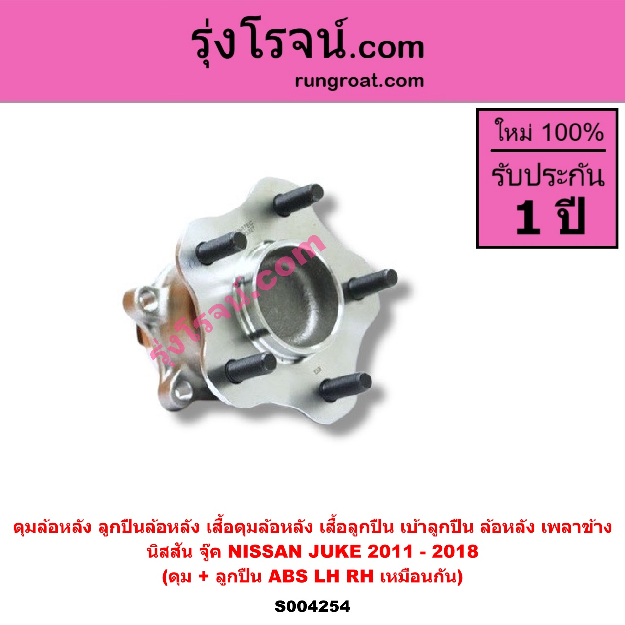 | S004254 | ดุมล้อหลัง (ลูกปืนล้อหลัง, เสื้อดุมล้อหลัง, เสื้อลูกปืน เบ้าลูกปืน ล้อหลัง เพลาข้าง) | NISSAN (นิสสัน) / JUKE (จู๊ค F15 2011 – 2018) | (ดุม + ลูกปืน) ABS LH, RH | ไต้หวัน (ใหม่) |