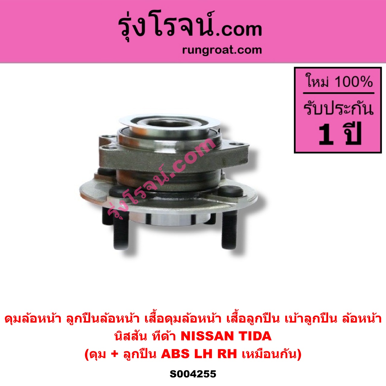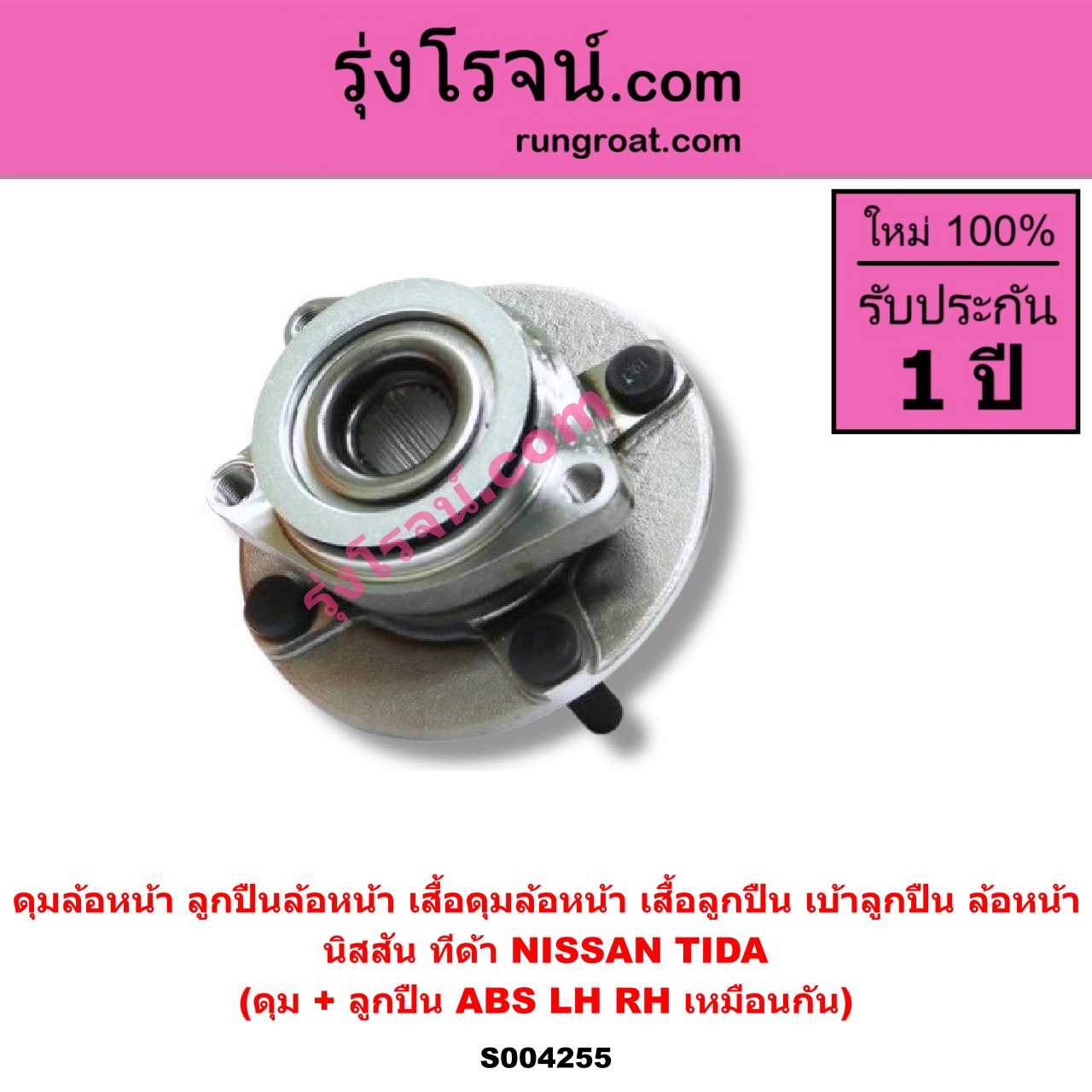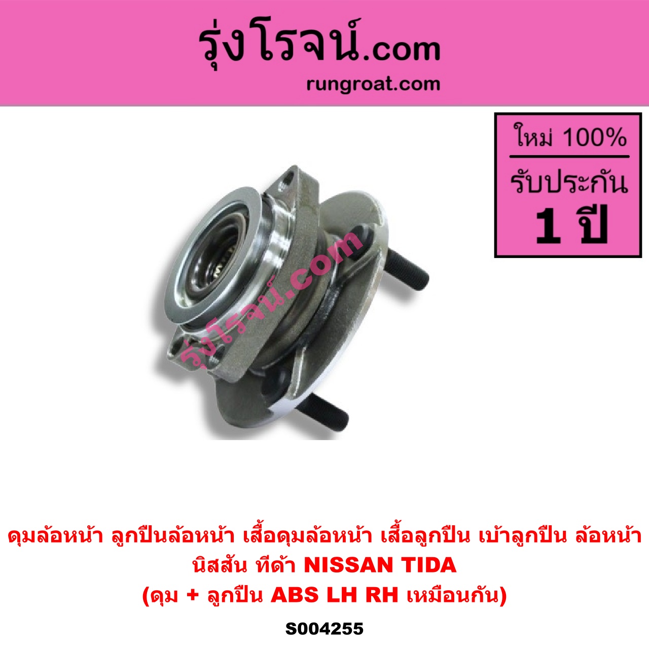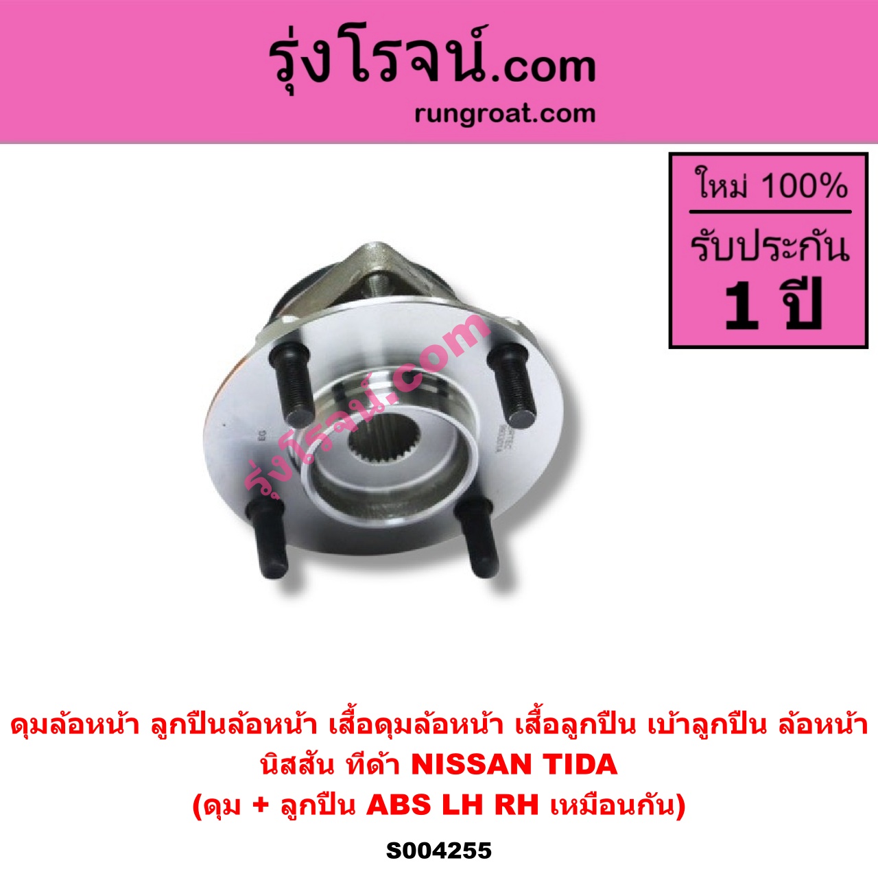 | S004255 | ดุมล้อหน้า (ลูกปืนล้อหน้า, เสื้อดุมล้อหน้า, เสื้อลูกปืน เบ้าลูกปืน ล้อหน้า) | NISSAN (นิสสัน) / TIDA (ทีด้า TIIDA 2006 – 2012) | (ดุม + ลูกปืน) ABS LH, RH | ไต้หวัน (ใหม่) |