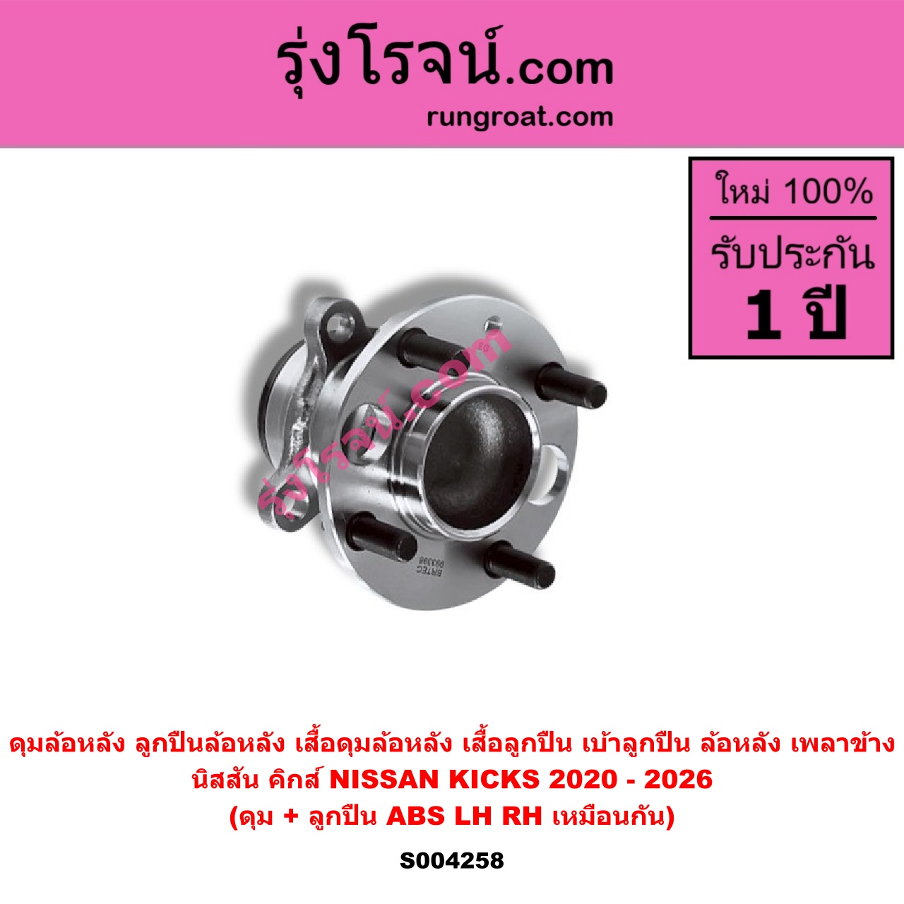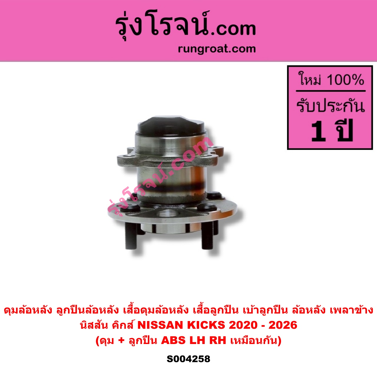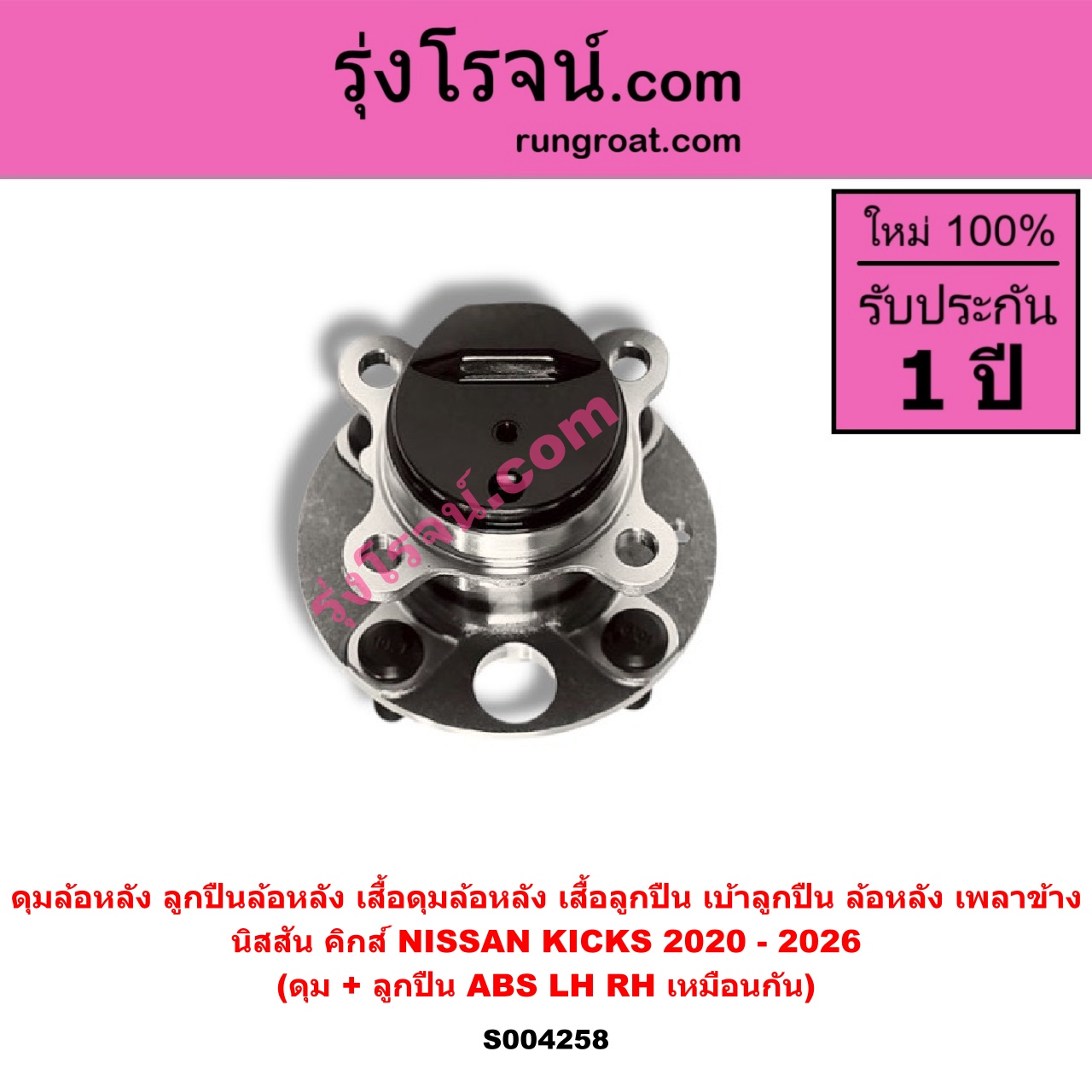 | S004258 | ดุมล้อหลัง (ลูกปืนล้อหลัง, เสื้อดุมล้อหลัง, เสื้อลูกปืน เบ้าลูกปืน ล้อหลัง เพลาข้าง) | NISSAN (นิสสัน) / KICKS (คิกส์) (2020 – 2026) | (ดุม + ลูกปืน) ABS LH, RH | ไต้หวัน (ใหม่) |