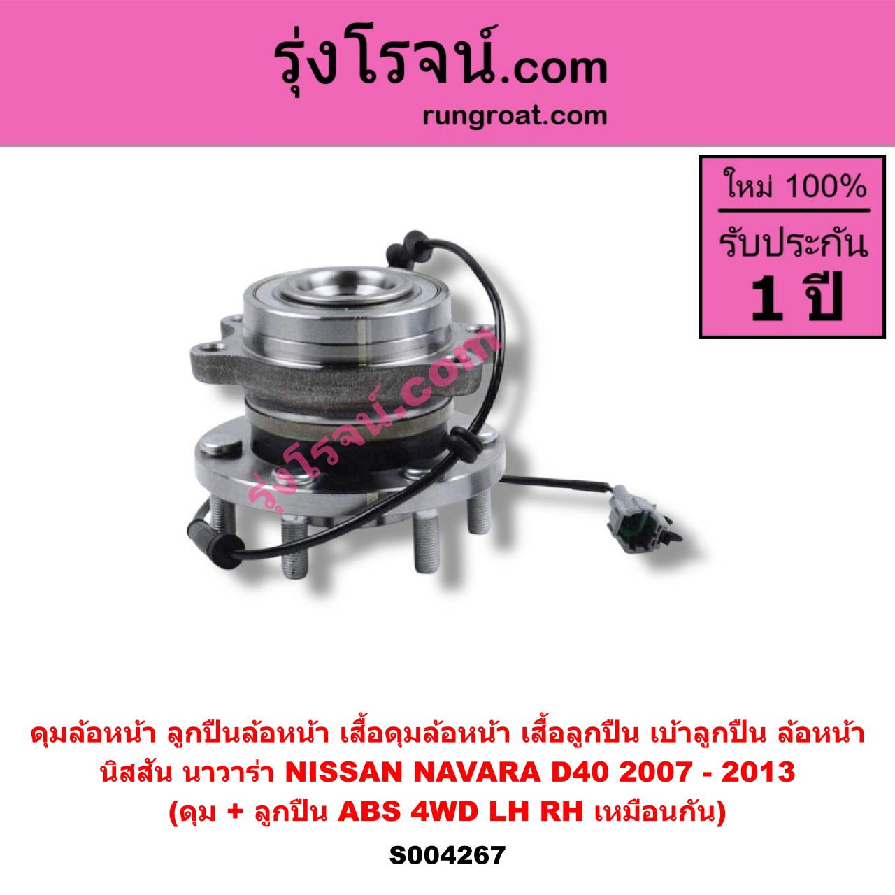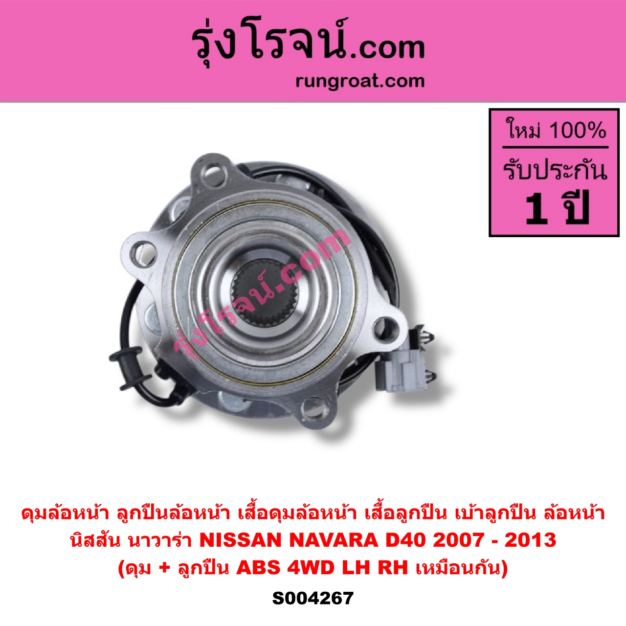 | S004267 | ดุมล้อหน้า (ลูกปืนล้อหน้า, เสื้อดุมล้อหน้า, เสื้อลูกปืน เบ้าลูกปืน ล้อหน้า) | NISSAN (นิสสัน) / NAVARA (นาวาร่า D40 2007 – 2013) (รุ่นแรก D40) | (ดุม + ลูกปืน) ABS 4WD LH, RH | ไต้หวัน (ใหม่) |