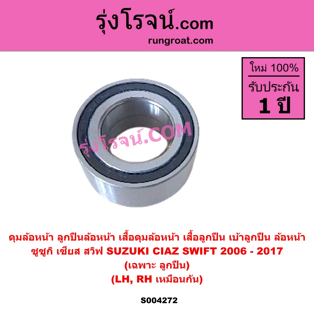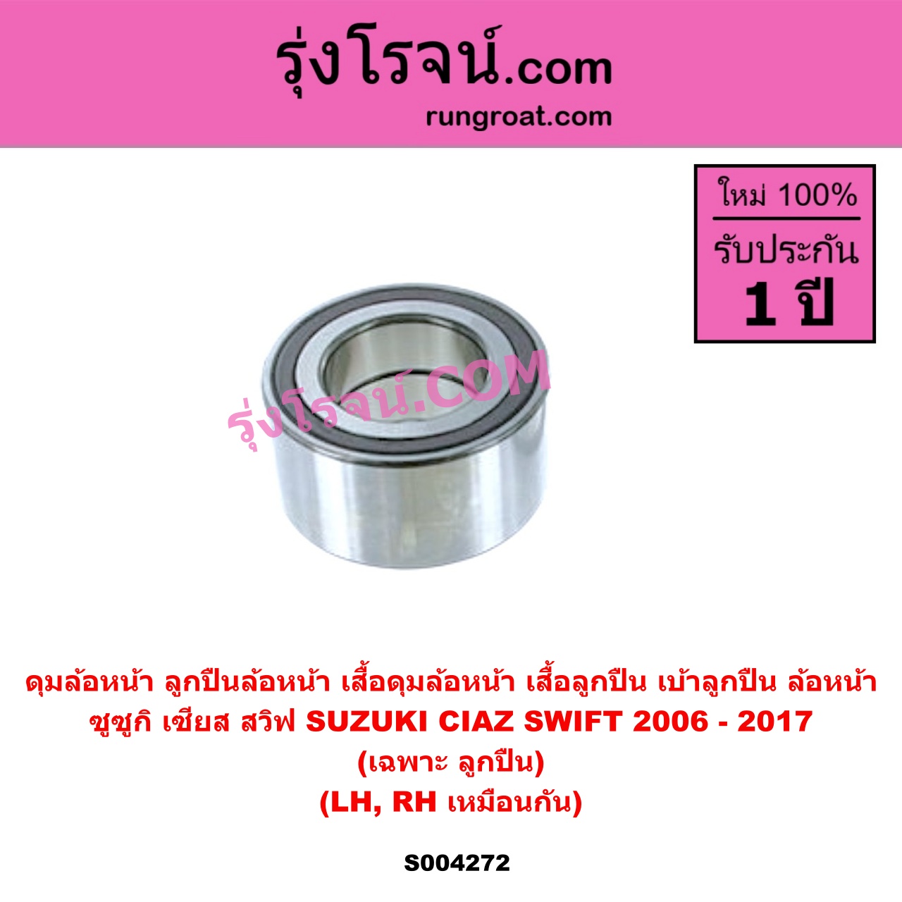 | S004272 | ดุมล้อหน้า (ลูกปืนล้อหน้า, เสื้อดุมล้อหน้า, เสื้อลูกปืน เบ้าลูกปืน ล้อหน้า) | SUZUKI (ซูซูกิ) / CIAZ (เซียส, ซีอาส 2015 – 2024) , SUZUKI (ซูซูกิ) / SWIFT (สวิฟ 2006 – 2011) (รุ่นแรก เครื่อง 1.5) , SUZUKI (ซูซูกิ) / SWIFT (สวิฟ 2012 – 2017) (รุ่น 2 เครื่อง 1.2) |