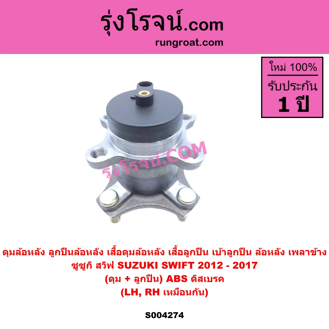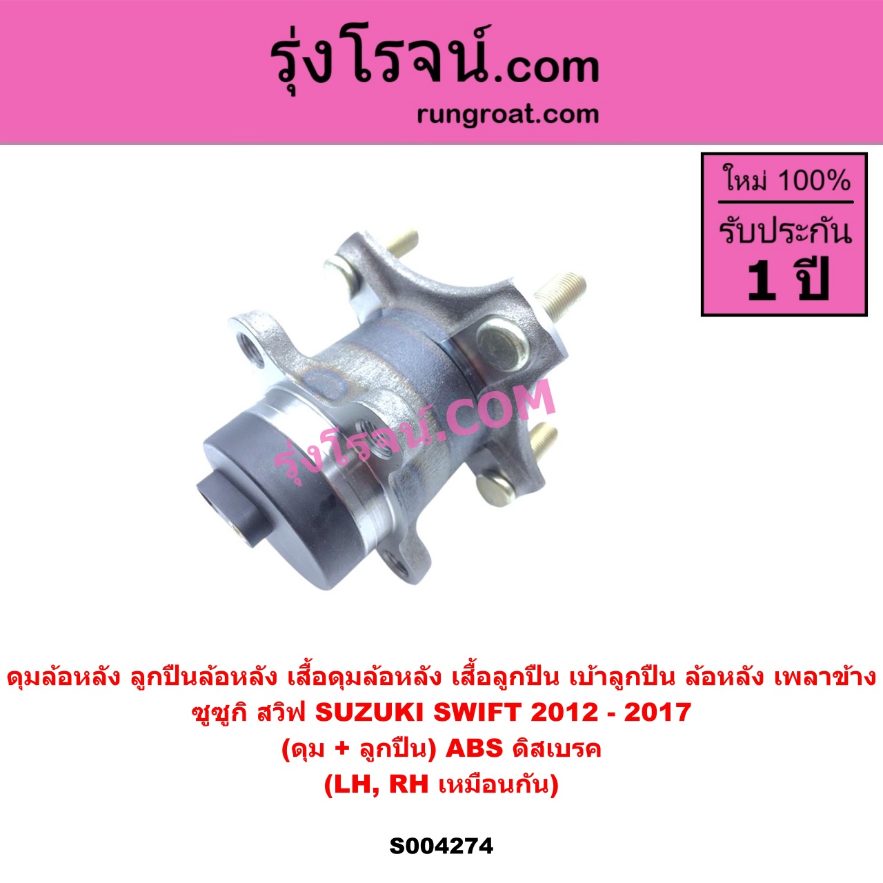 | S004274 | ดุมล้อหลัง (ลูกปืนล้อหลัง, เสื้อดุมล้อหลัง, เสื้อลูกปืน เบ้าลูกปืน ล้อหลัง เพลาข้าง) | SUZUKI (ซูซูกิ) / SWIFT (สวิฟ 2012 – 2017) (รุ่น 2 เครื่อง 1.2) | (ดุม + ลูกปืน) ABS ดิสเบรค LH, RH | ไต้หวัน (ใหม่) |