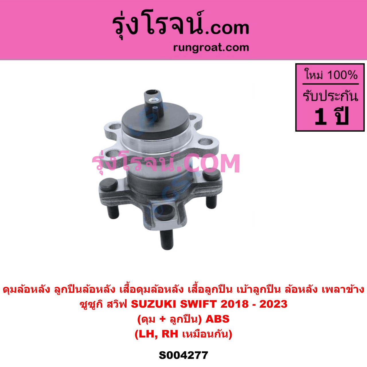 | S004277 | ดุมล้อหลัง (ลูกปืนล้อหลัง, เสื้อดุมล้อหลัง, เสื้อลูกปืน เบ้าลูกปืน ล้อหลัง เพลาข้าง) | SUZUKI (ซูซูกิ) / SWIFT (สวิฟ 2018 – 2023) (รุ่น 3) | (ดุม + ลูกปืน) ABS LH, RH | ไต้หวัน (ใหม่) |