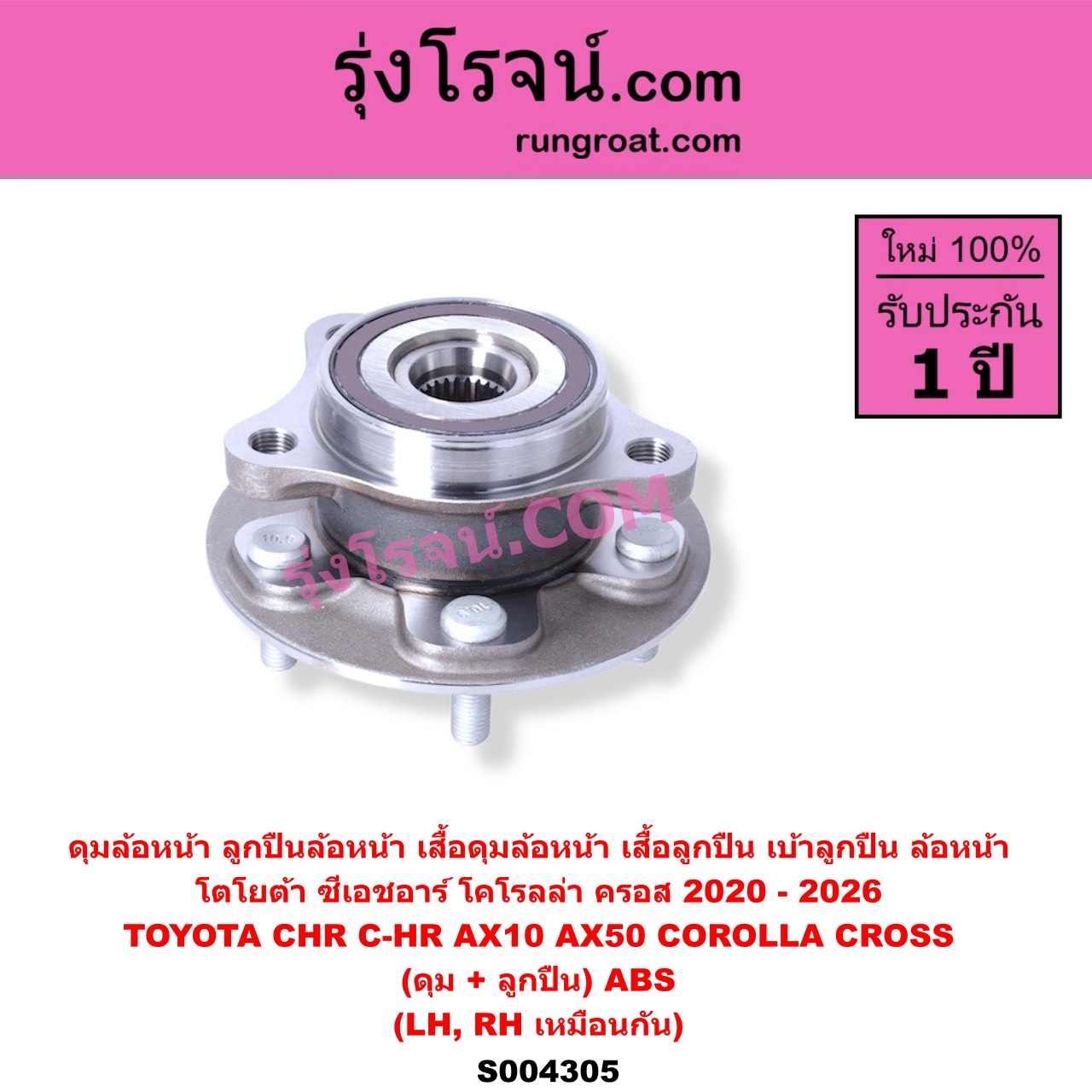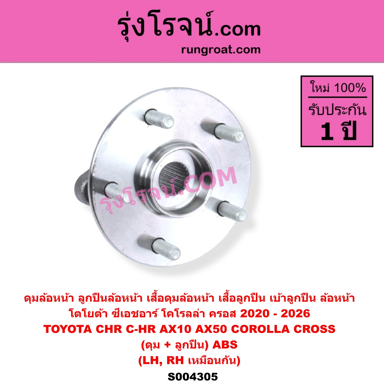 | S004305 | ดุมล้อหน้า (ลูกปืนล้อหน้า, เสื้อดุมล้อหน้า, เสื้อลูกปืน เบ้าลูกปืน ล้อหน้า) | TOYOTA (โตโยต้า) / CHR (C-HR, ซีเอชอาร์) (AX10 AX50) , TOYOTA (โตโยต้า) / COROLLA CROSS (โคโรลล่า ครอส, โคโรล่า ครอส) (2020 – 2026) |