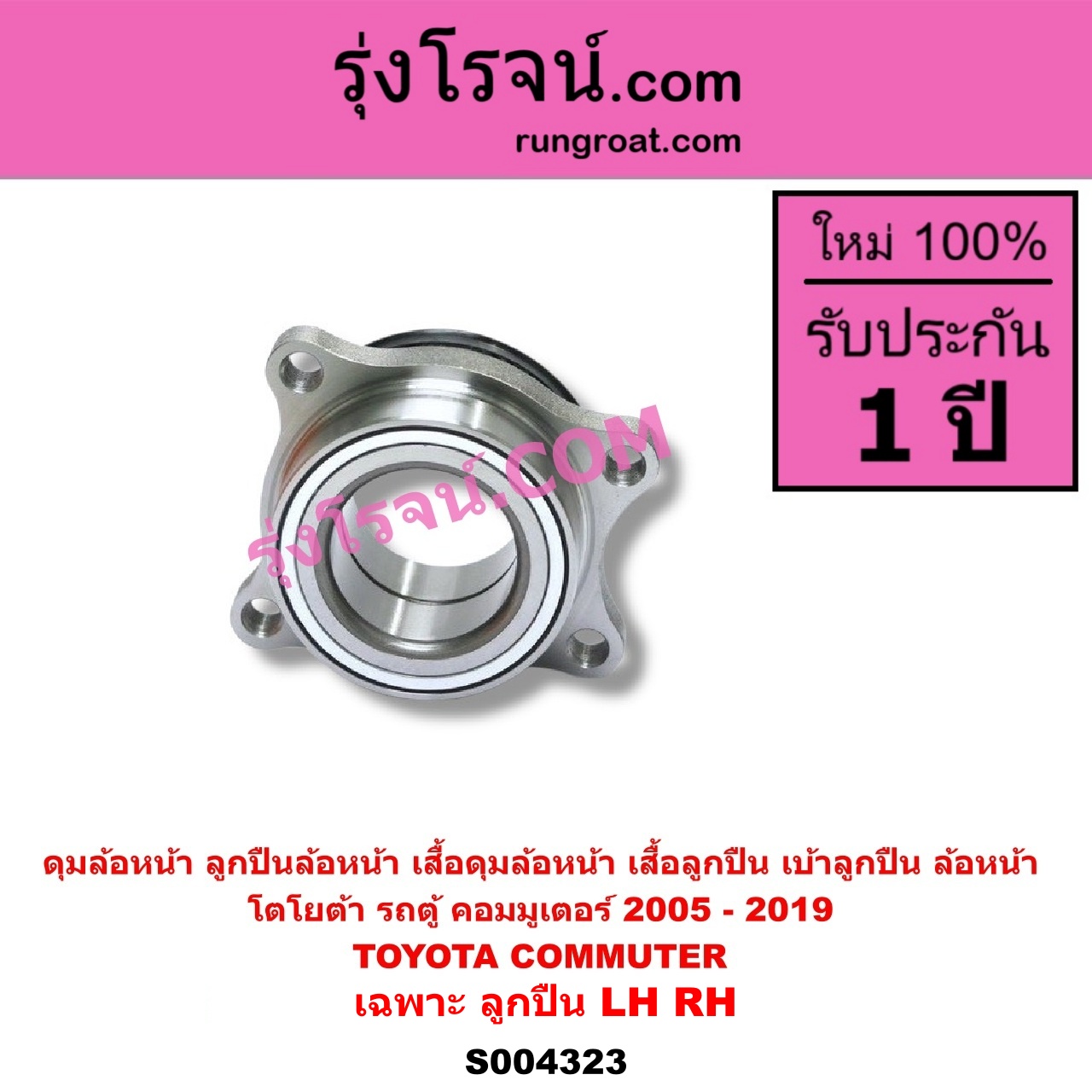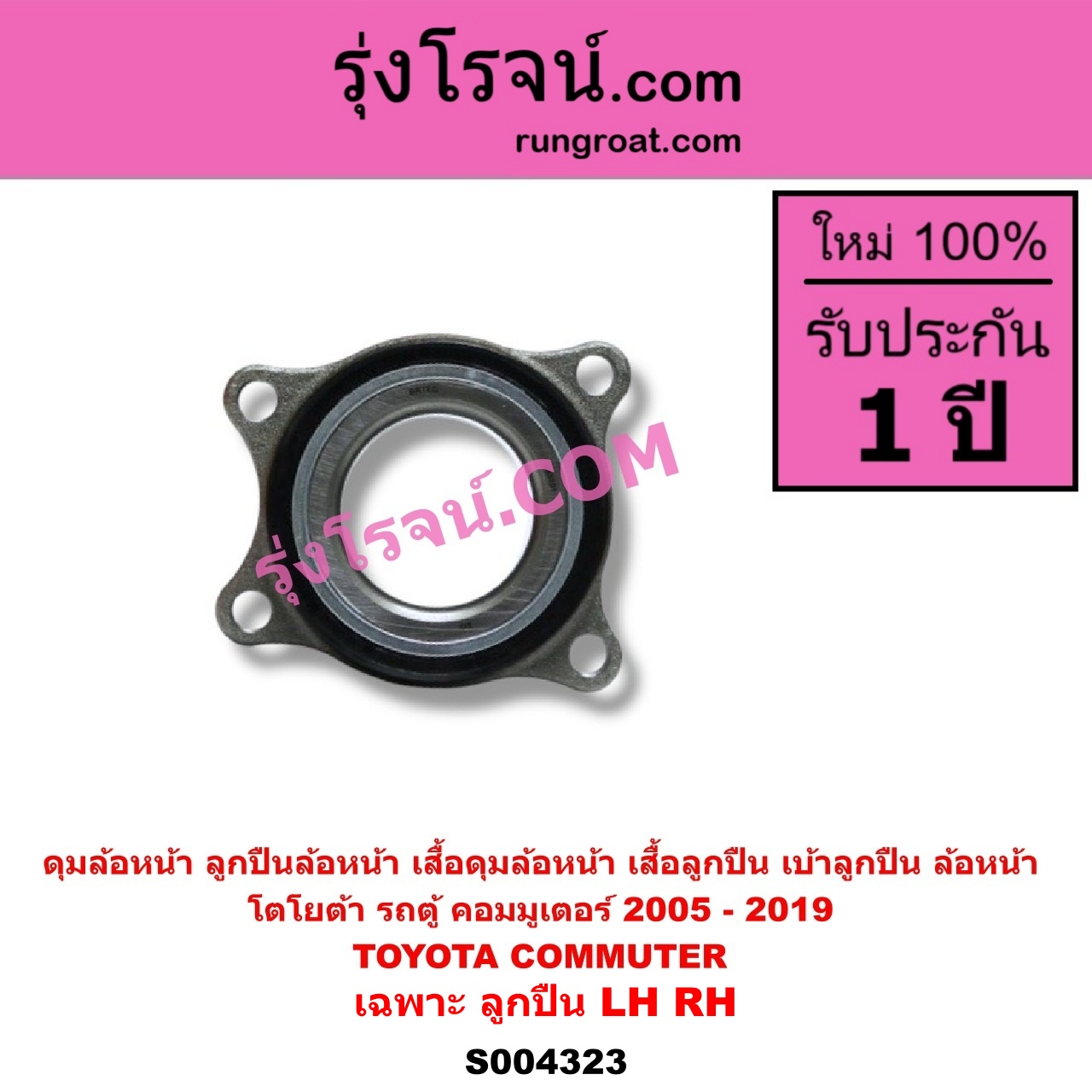 | S004323 | ดุมล้อหน้า (ลูกปืนล้อหน้า, เสื้อดุมล้อหน้า, เสื้อลูกปืน เบ้าลูกปืน ล้อหน้า) | TOYOTA (โตโยต้า) / COMMUTER (รถตู้ คอมมิวเตอร์ คอมมูเตอร์ 2005 – 2019) | (เฉพาะ ลูกปืน) LH, RH | ไต้หวัน (ใหม่) |