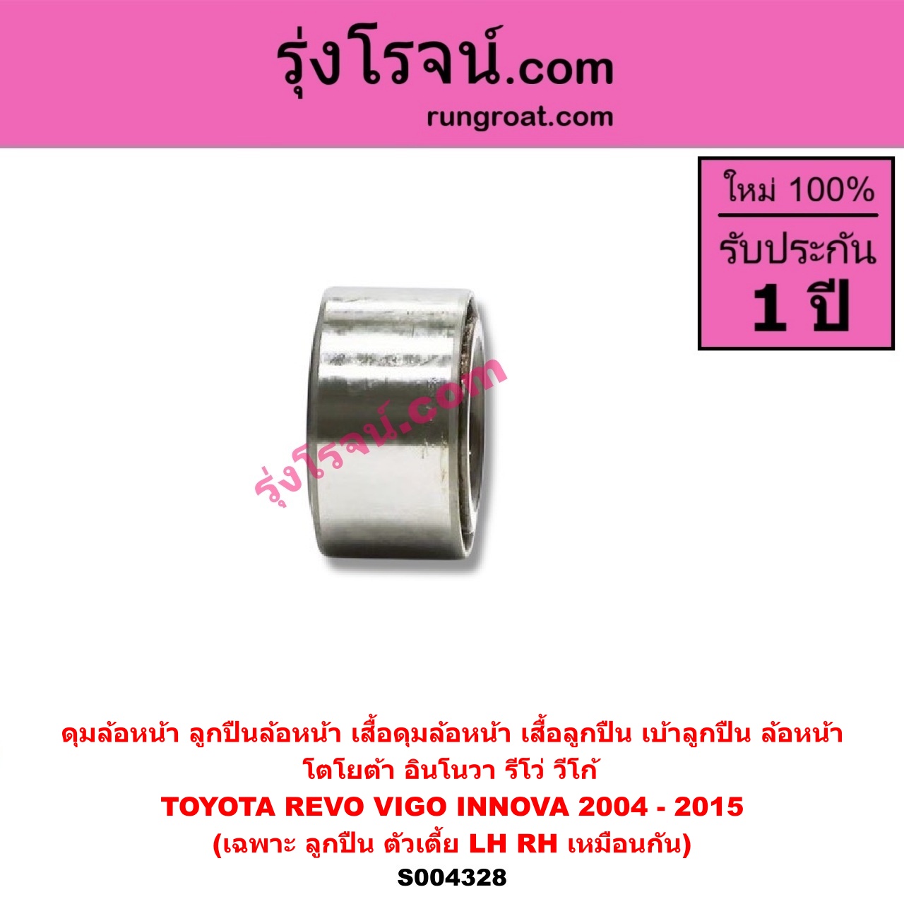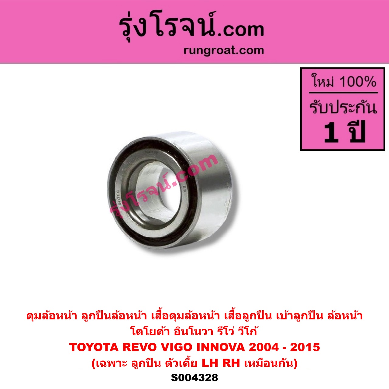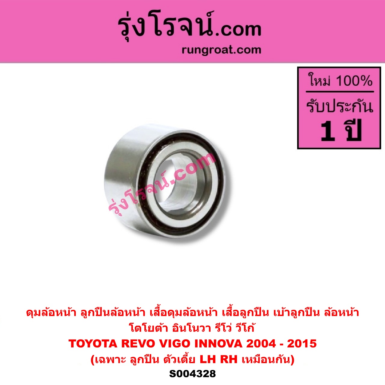 | S004328 | ดุมล้อหน้า (ลูกปืนล้อหน้า, เสื้อดุมล้อหน้า, เสื้อลูกปืน เบ้าลูกปืน ล้อหน้า) | TOYOTA (โตโยต้า) / INNOVA (อินโนวา 2004 – 2015) , TOYOTA (โตโยต้า) / REVO (รีโว รีโว่ 2015 – 2023) (โฉมแรก / ROCCO) , TOYOTA (โตโยต้า) / VIGO (วีโก้ 2004 – 2015) |