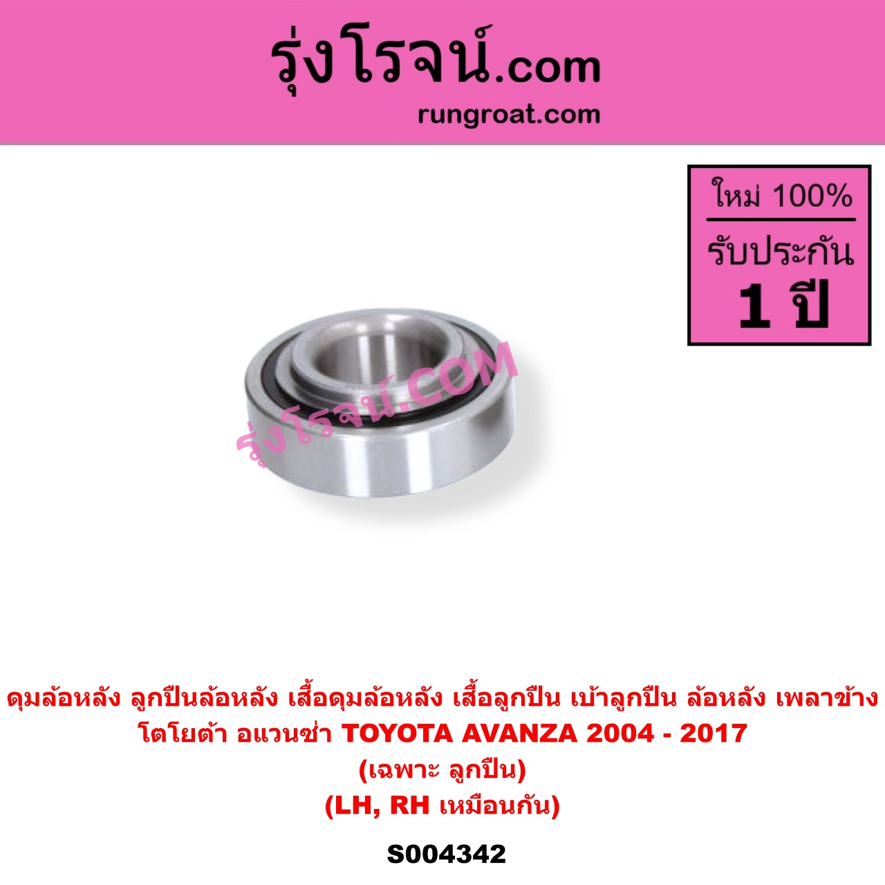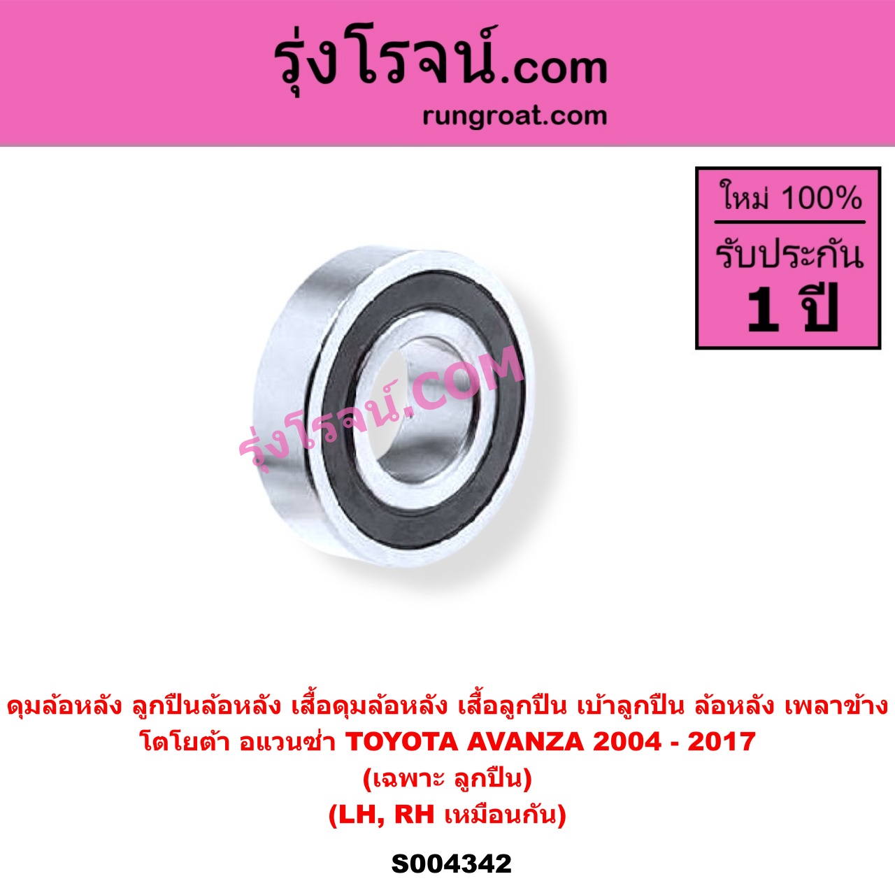 | S004342 | ดุมล้อหลัง (ลูกปืนล้อหลัง, เสื้อดุมล้อหลัง, เสื้อลูกปืน เบ้าลูกปืน ล้อหลัง เพลาข้าง) | TOYOTA (โตโยต้า) / AVANZA (อแวนซ่า 2004 – 2011) (รุ่นแรก) , TOYOTA (โตโยต้า) / AVANZA (อแวนซ่า 2012 – 2017) (รุ่น 2) |