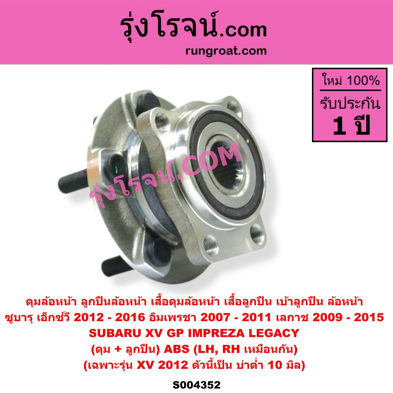 | S004352 | ดุมล้อหน้า (ลูกปืนล้อหน้า, เสื้อดุมล้อหน้า, เสื้อลูกปืน เบ้าลูกปืน ล้อหน้า) | SUBARU (ซูบารุ) / IMPREZA (อิมเพรซา) (2007 – 2011) , SUBARU (ซูบารุ) / LEGACY (เลกาซี) (2009 – 2015) , SUBARU (ซูบารุ) / XV (เอ็กซ์วี GP) (2012 – 2016) |
