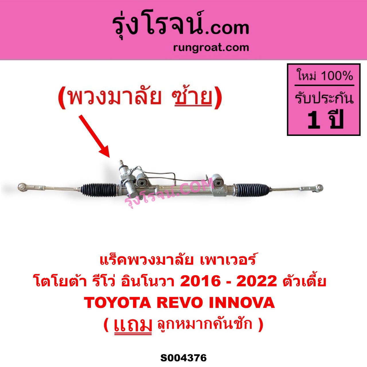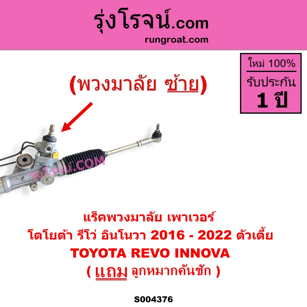 | S004376 | แร็คพวงมาลัย (แร็คเพาเวอร์) | TOYOTA (โตโยต้า) / INNOVA (อินโนวา 2016 – 2022) , TOYOTA (โตโยต้า) / REVO (รีโว รีโว่ 2015 – 2023) (โฉมแรก / ROCCO) |