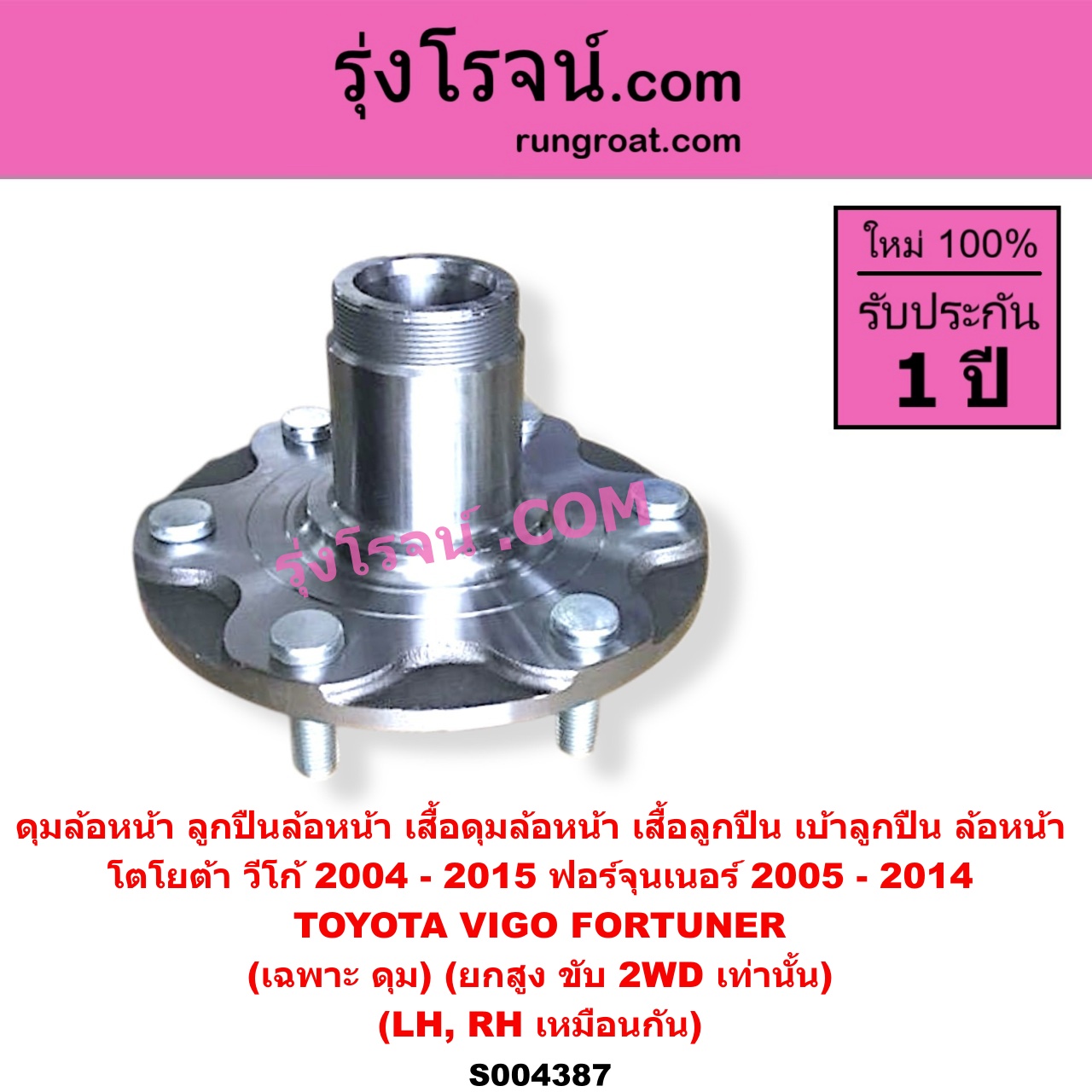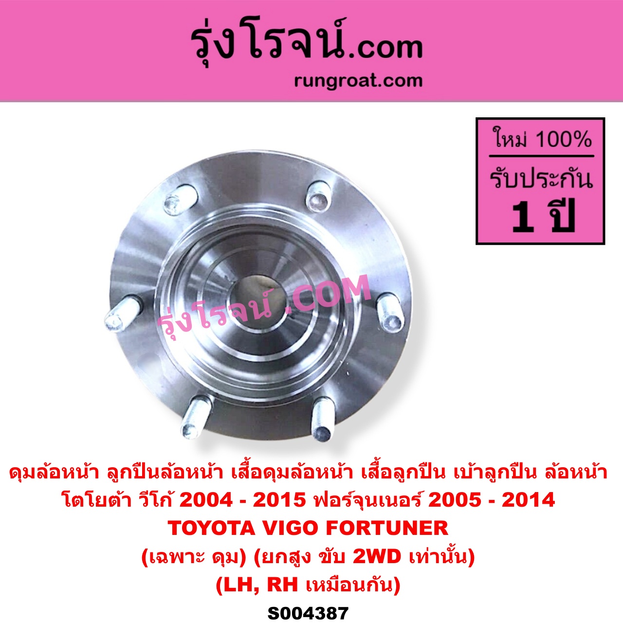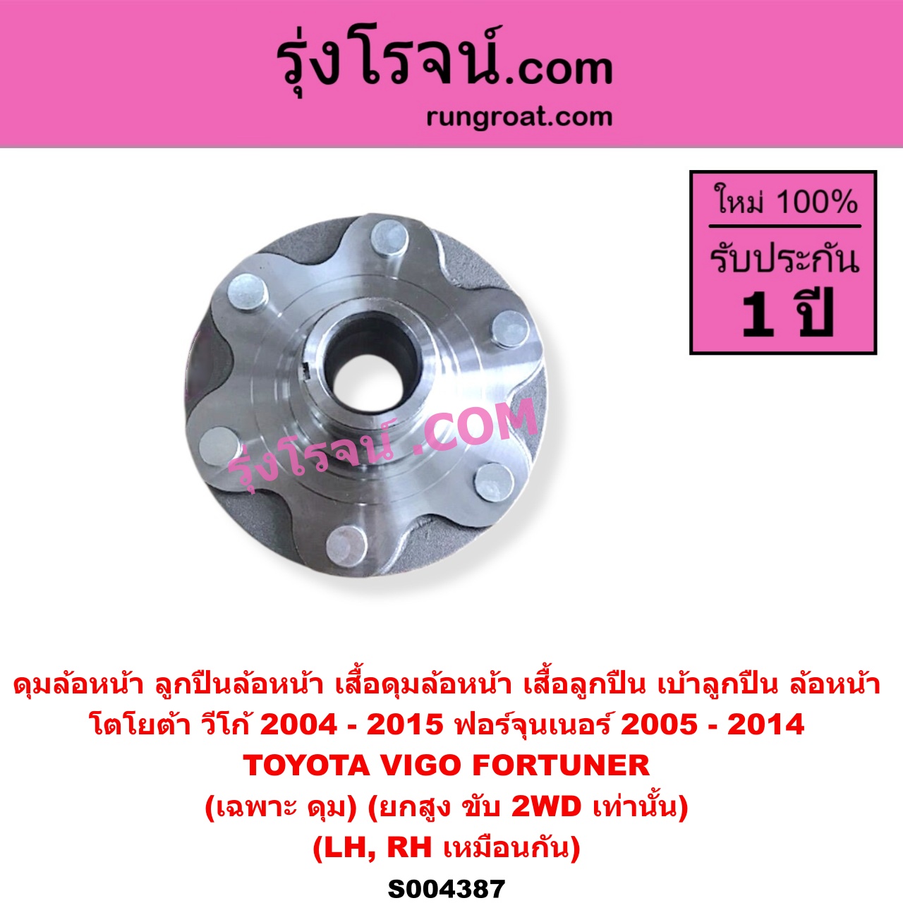 | S004387 | ดุมล้อหน้า (ลูกปืนล้อหน้า, เสื้อดุมล้อหน้า, เสื้อลูกปืน เบ้าลูกปืน ล้อหน้า) | TOYOTA (โตโยต้า) / FORTUNER (ฟอร์จูนเนอร์ 2005 – 2014) (รุ่นแรก) , TOYOTA (โตโยต้า) / VIGO (วีโก้ 2004 – 2015) |